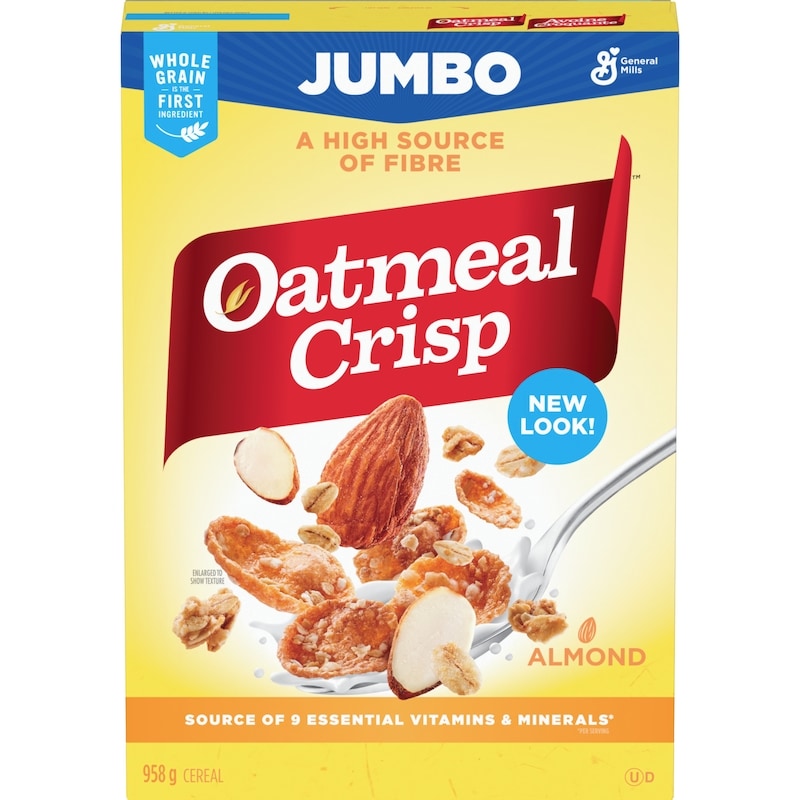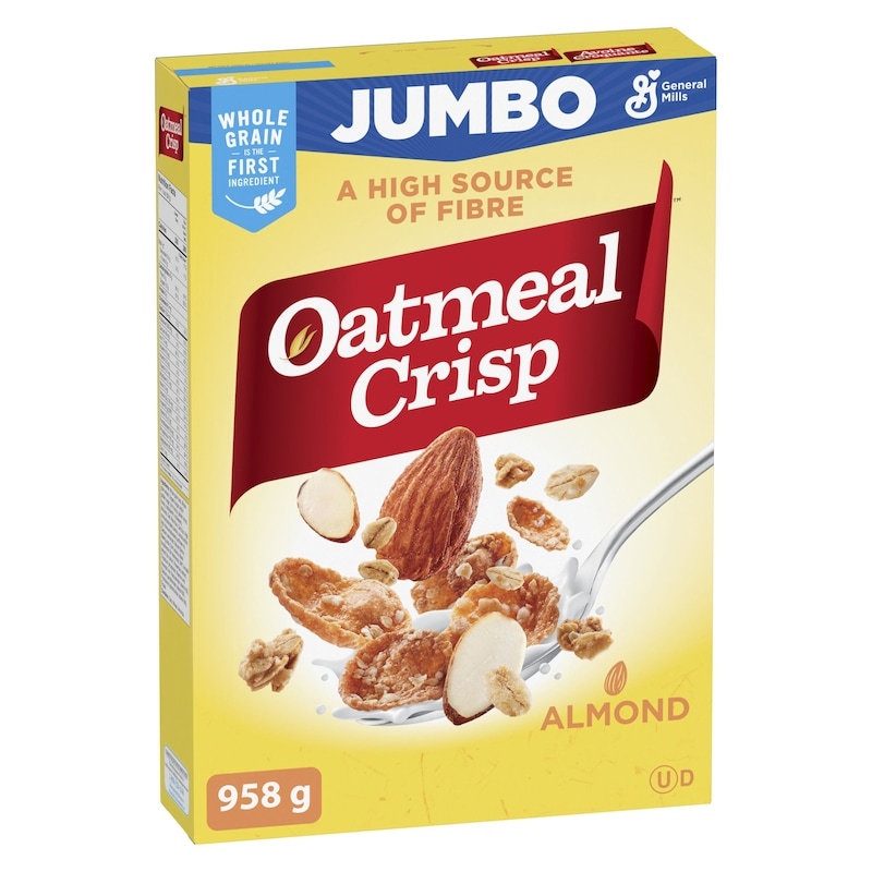 Your search for sources of fibre has ended. Oatmeal Crisp Breakfast Cereal is here for you. Oatmeal Crisp Almond Breakfast Cereal provides a wholesome start to your day and an easy way to add a high source of fibre to your diet. This crunchy fibre cereal combines flakes from whole grain oats and wheat with tasty almond slices. Oatmeal Crisp Almond Breakfast Cereal is perfect for breakfast with milk or yogurt, as an afternoon snack, or added to your favourite trail mix. Oatmeal Crisp Almond Breakfast Cereal is a family favourite perfect for adults, kids, and everyone in between. This tasty cereal features whole grain as the first ingredient and is a high source of fibre. Contains one 958 g Jumbo Size cereal box in total.