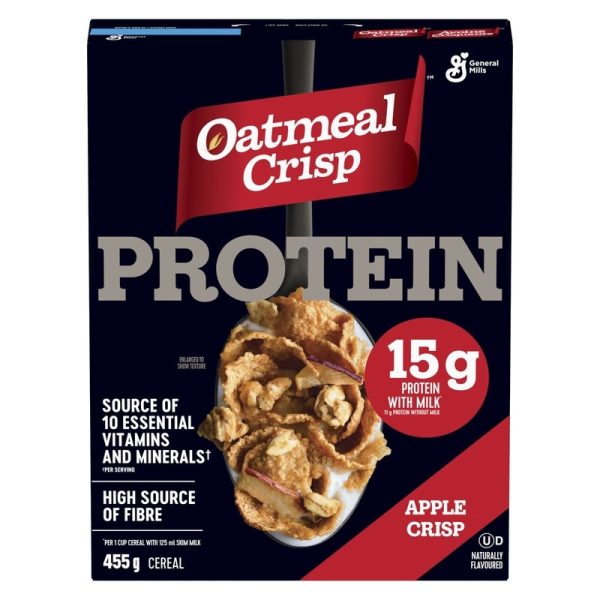 Delicious, crunchy Oatmeal Crisp cereal – now with protein.Lightly sweetened flakes and crunchy granola made with protein, plus real dried apple pieces. Whether served alone, with milk, yogurt, and/or your favourite berries and nuts, this is a great cereal that can be part of a complete meal. Create a trail mix by adding nuts and dried fruit or take a twist on the traditional snack bar and mix cereal with melted marshmallows.Try Oatmeal Crisp Protein and other General Mills cereals today