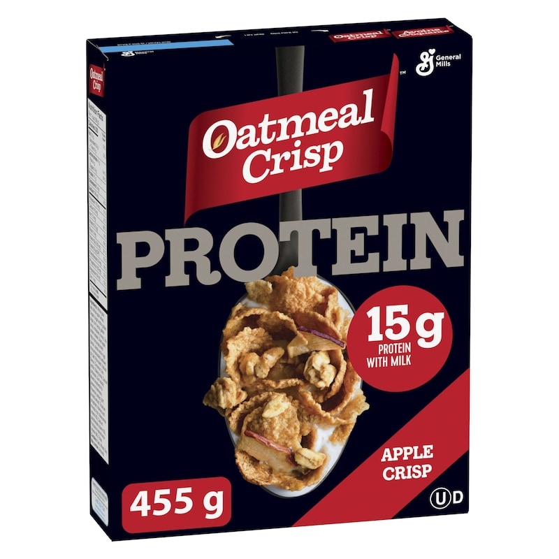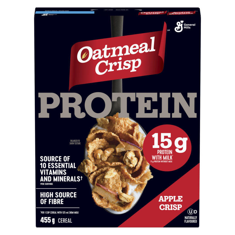 Delicious, crunchy Oatmeal Crisp cereal – now with protein.Lightly sweetened flakes and crunchy granola made with protein, plus real dried apple pieces. Whether served alone, with milk, yogurt, and/or your favourite berries and nuts, this is a great cereal that can be part of a complete meal. Create a trail mix by adding nuts and dried fruit or take a twist on the traditional snack bar and mix cereal with melted marshmallows.Try Oatmeal Crisp Protein and other General Mills cereals today