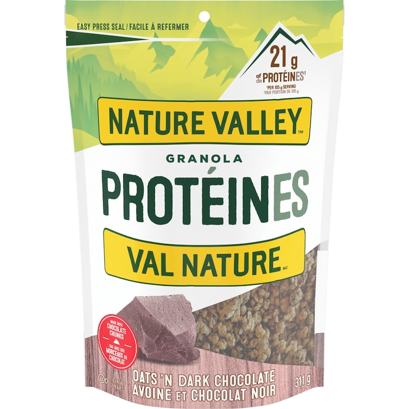 The Original Crunch. Nature Valley Oats ‘n Dark Chocolate Protein Granola combines crunchy whole-grain oat clusters and chocolate chunks. So whether you enjoy a bowlful as a breakfast cereal or take along the bag for family snacks on the run, this granola mix delivers on the go energy. Add your own fruits and nuts for DIY trail mix. The resealable bag makes for easy breakfast on the go. At Nature Valley, we believe that what you put in is what you get out. So when you need to be great out there, you can rely on us for real energy, wherever and whenever you need it. Energy you can depend on. Contains one 311 g resealable bag of protein granola in total.