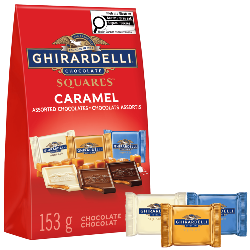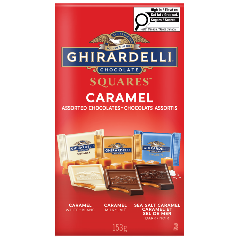 Savour the sweet, creamy flavour of GHIRARDELLI Assorted Caramel Chocolate Squares. This Limited-edition box contains three classic flavour combinations, White Chocolate & Caramel, Milk Chocolate & Caramel, and Dark Chocolate & Sea Salt Caramel. With smooth chocolate exterior and a flowing, buttery caramel centre, these chocolate squares are made from only the finest ingredients and are individually wrapped, perfect for sharing, enjoying on the go.