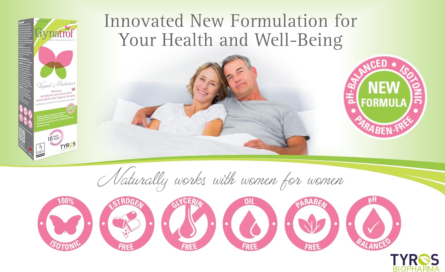 - HORMONE FREE: GYNATROF is a non-hormonal approach for the treatment of vaginal atrophy. Improves moistness and tension of the perivaginal and vaginal epithelium. Gynatrof has been reviewed and approved to be part of the new "Brand Recognition Program" recently introduced by the Society of Obstetricians and Gynaecologists of Canada (SOGC).
