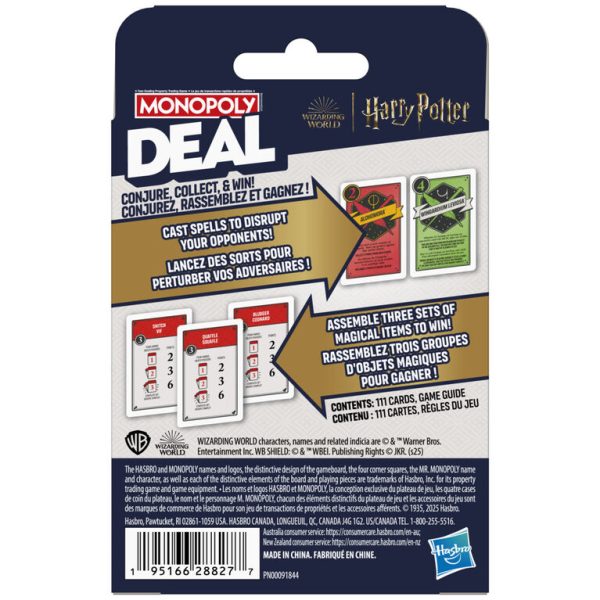 Conjure, collect, and win! In the Monopoly Deal: HARRY POTTER kids card game, a wealth of enchanted objects is waiting to be found. Be the first witch or wizard to collect 3 different sets of magical items to win. Cast spells over opponents to disrupt their plans – and receive help from iconic heroes and villains while dueling for control over the riches of the WIZARDING WORLD! This fun family card game for kids and adults can be played in about 15 minutes, so it’s an ideal game for fitting in family fun anytime. And HARRY POTTER toys and games are wonderful holiday and birthday gifts for teens, adults, and kids. WIZARDING WORLD characters, names, and all related indicia are copyright and trademark Warner Bros. Entertainment Inc. WB SHIELD: Copyright and trademark WBEI. Publishing Rights Copyright JKR. (s25) The HASBRO and MONOPOLY names and logos, the distinctive design of the gameboard, the four corner squares, the MR. MONOPOLY name and character, as well as each of the distinctive elements of the board and playing pieces are trademarks of Hasbro, Inc. for its property trading game and game equipment.