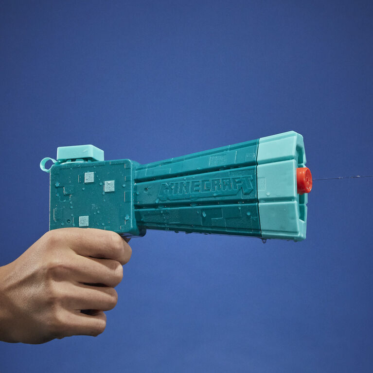 The Nerf Super Soaker Minecraft Glow Squid water blaster takes its inspiration from the aquatic squid mob in Minecraft. Dive into water-blasting excitement with this Nerf Super Soaker Minecraft water toy in high-energy outdoor games. Kids can play outside for active backyard water fun as they soak opponents with streams of water. Easy to use, so you’ll be drenching friends and family in no time! Open the cap, fill the tank with water, close the cap, then press the button to unleash a streaming blast of water at anyone in range. This cool toy for boys and girls is an awesome gift for Minecraft fans and a great addition to Nerf blaster collections. Eyewear recommended (not included).