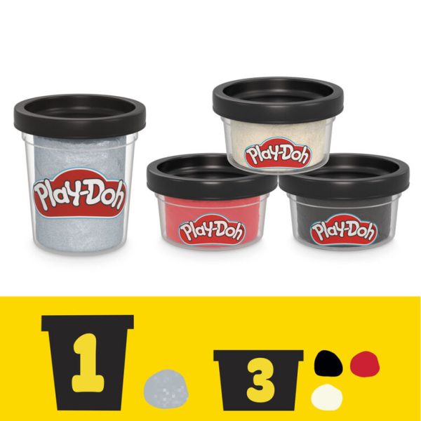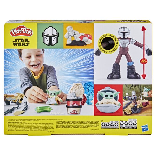 Includes speeder, Mandalorian figure, Grogu figure, stamper, 3 book-mold display stands, and 4 cans of Play-Doh Brand Modeling Compound (net wt. 5 oz/142 g).