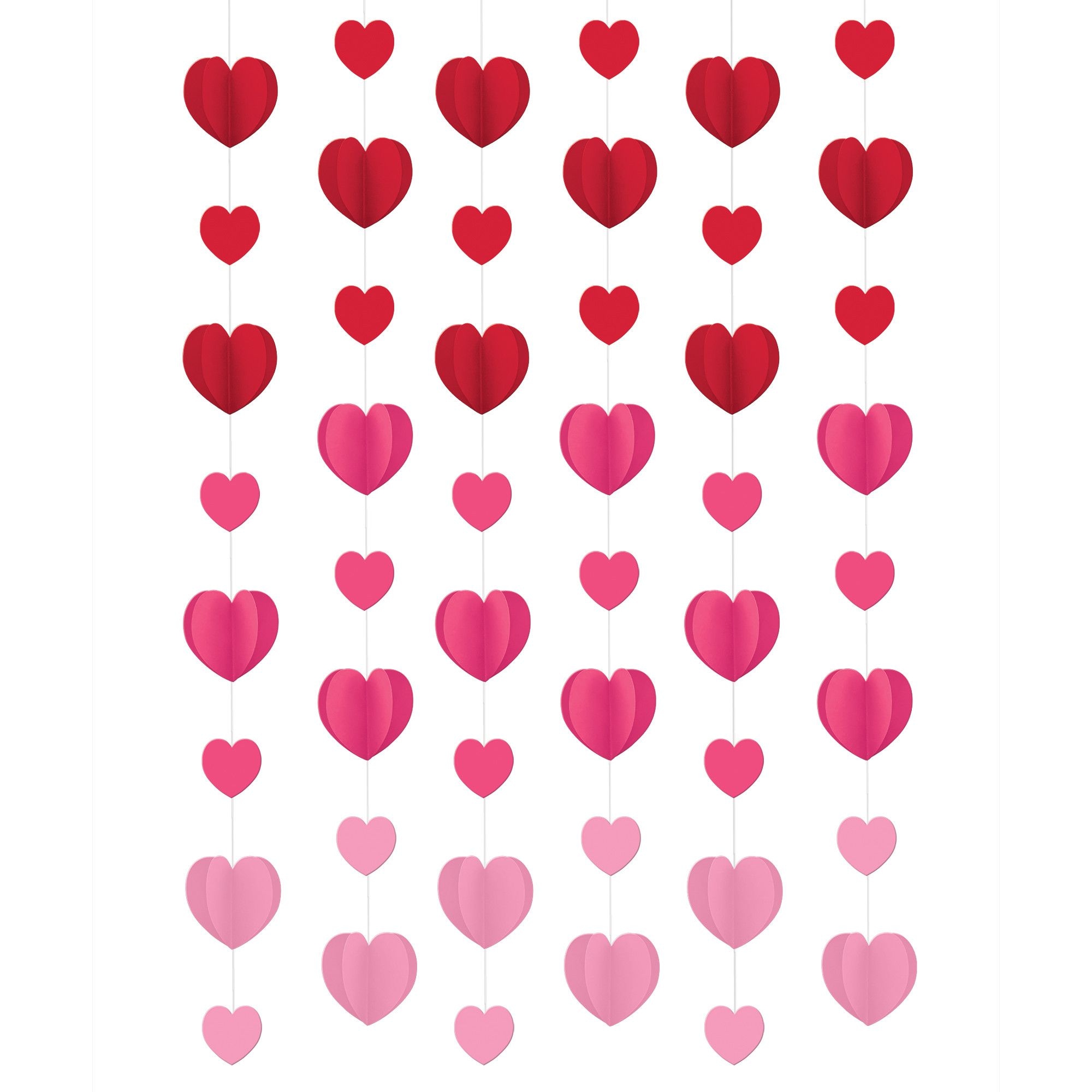 Amscan’s Valentine’s Day Dimensional Hearts String Decoration adds instant festivity to your holiday decor. The string of hearts starts vivid red at the top, fading to pale pink at the bottom for a colorful, whimsical effect. Hang the 7-foot long string in your doorway or window to highlight its colorful 3D and 2D hearts ranging from 4 to 3 inches. There are six hearts total in the package, so you have multiple options to customize your Valentine’s decor. (122 words)