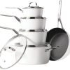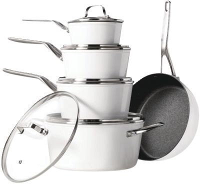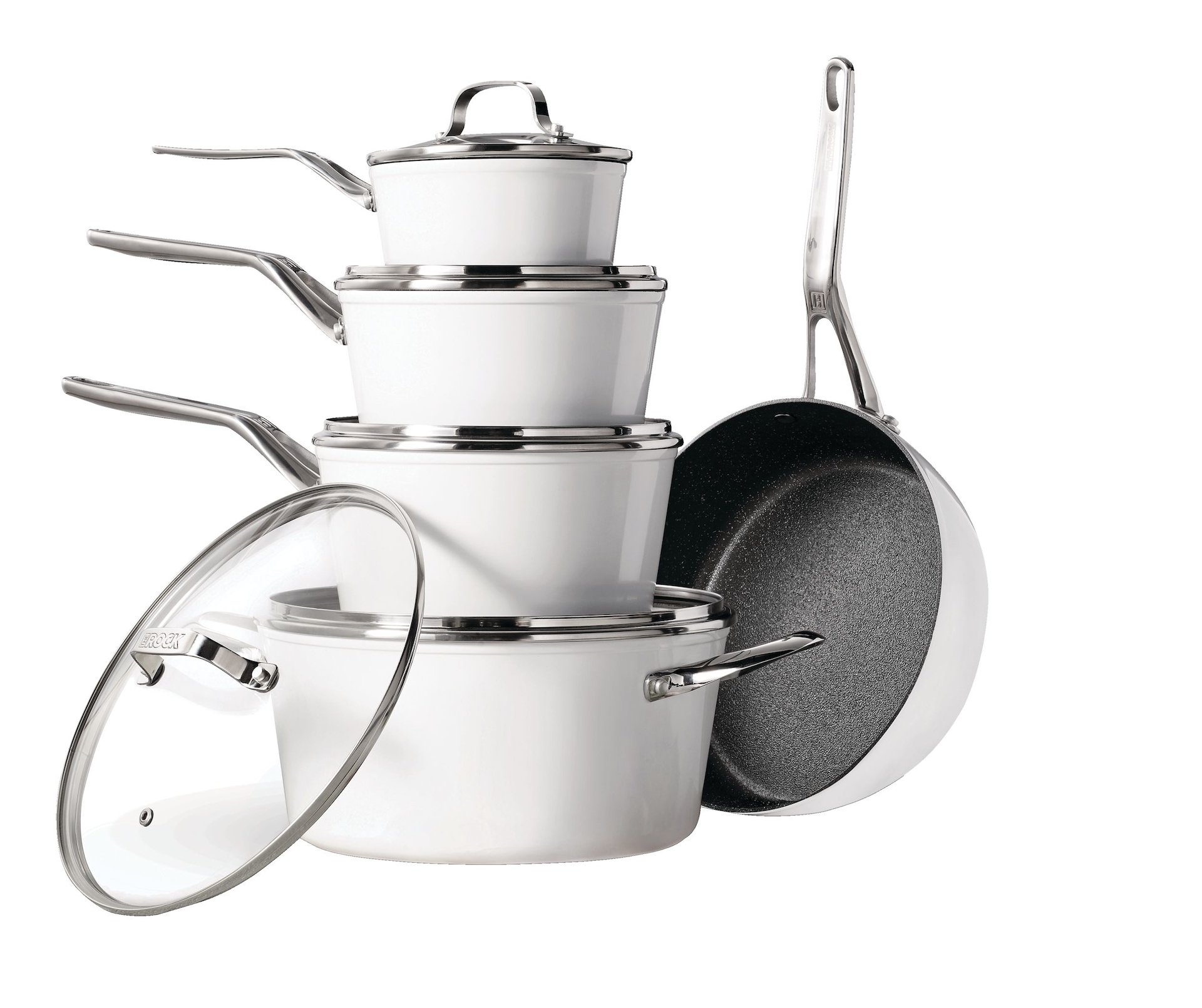 Update your pots and pans with The Rock ZERO Cookware Set for healthier cooking and superior performance. Featuring Rock.Tec non-stick surface treatment, this white, ceramic cookware is 3 times more durable than traditional non-stick cookware, with unmatched food release and easy maintenance. The set comes with 10 essential pieces perfect for home cooks and safe for use on all types of cook tops, including induction, ceramic and gas burners.