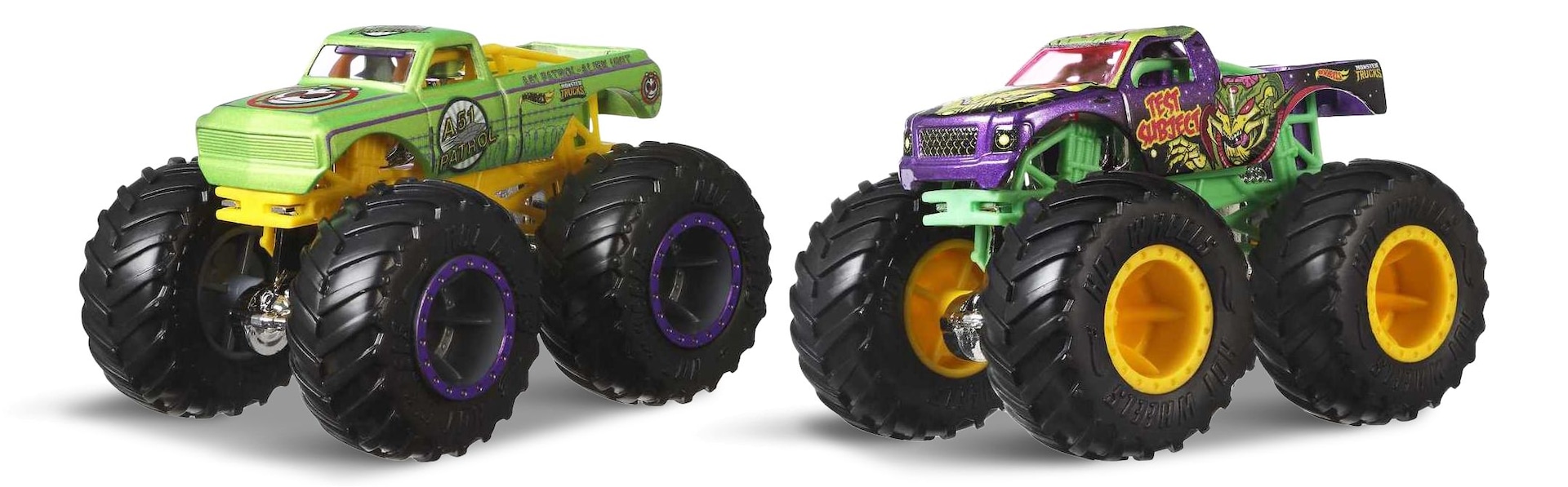 The Hot Wheels® Monster Trucks 1:64 Scale Demolition Doubles™ trucks stand by to smash their arch-rivals! These two-packs of Monster Trucks squaring-off for epic crash attacks are purposely paired for head-to-head battles with their GIANT wheels and big personalities! Every package includes two opponents and the package provides stats for each including name, truck type, strength, unique crash attack and motor-vation for great storytelling fun! Each sold separately, subject to availability. Colors and decorations may vary.