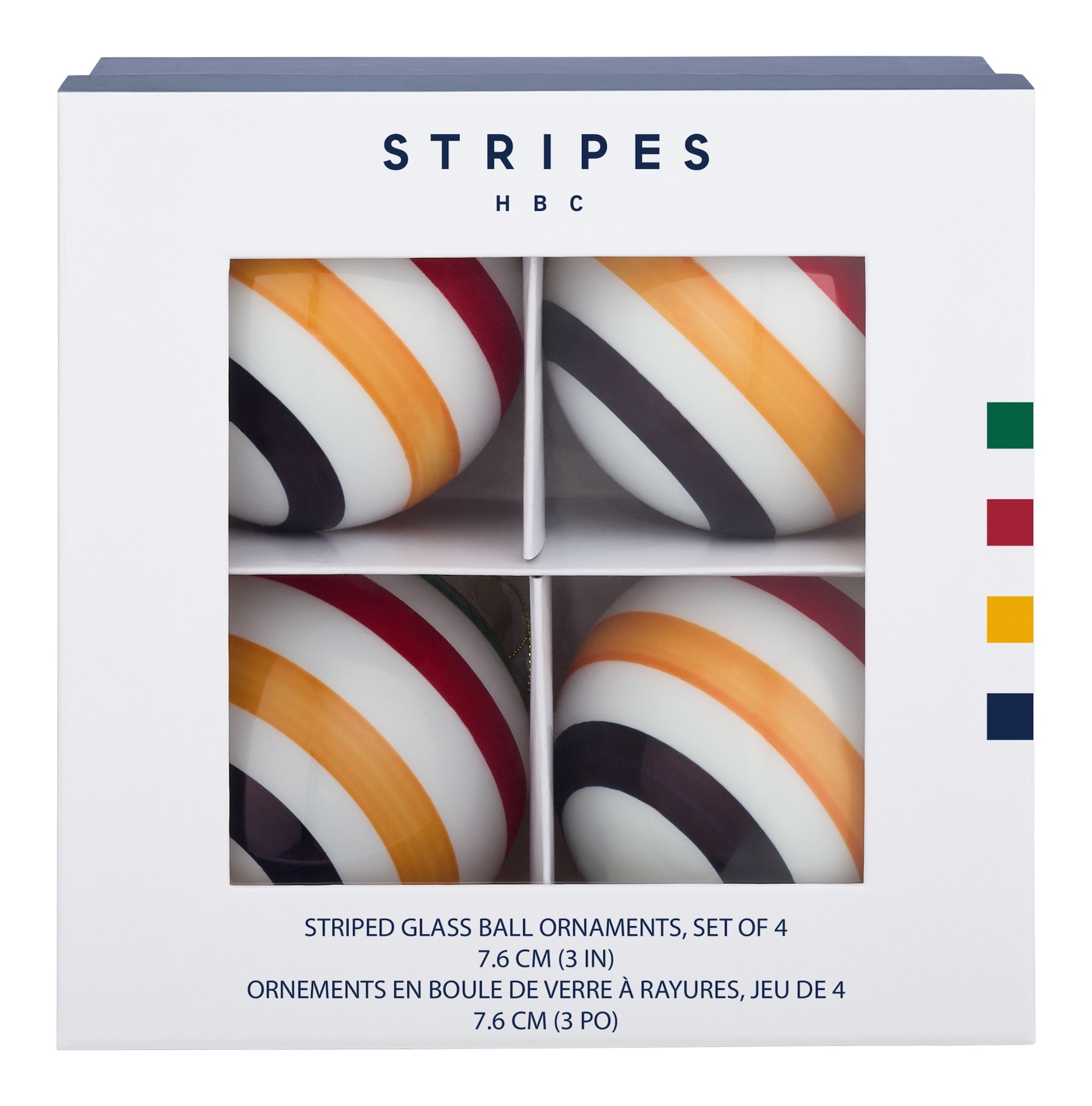 Celebrate Canadian heritage with the Hudson’s Bay Stripes™ Glass Ball Christmas Ornaments. Featuring the iconic Hudson’s Bay Stripes, this 4-pack adds timeless elegance to both traditional and modern holiday décor styles. These classic glass ball ornaments are perfect for those who appreciate refined and sophisticated decorations, bringing a touch of festive charm to any setting.