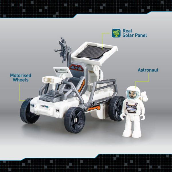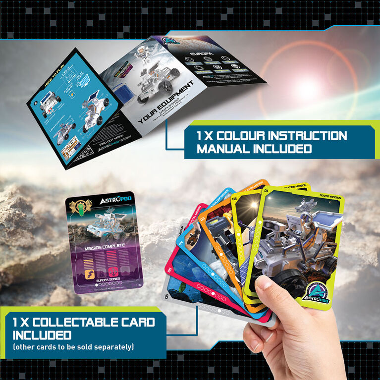 Introducing the Astropod Rover Mission-the ultimate toy for kids over 6 years old who love spaceexploration! Assemble your very own Space Rover using 23 high-quality components, including gears, wheels, a motor, and wires. Power it with a battery or harness the sun’s energy using a genuine solar panel to move forward on your galactic journey to EUROPA!