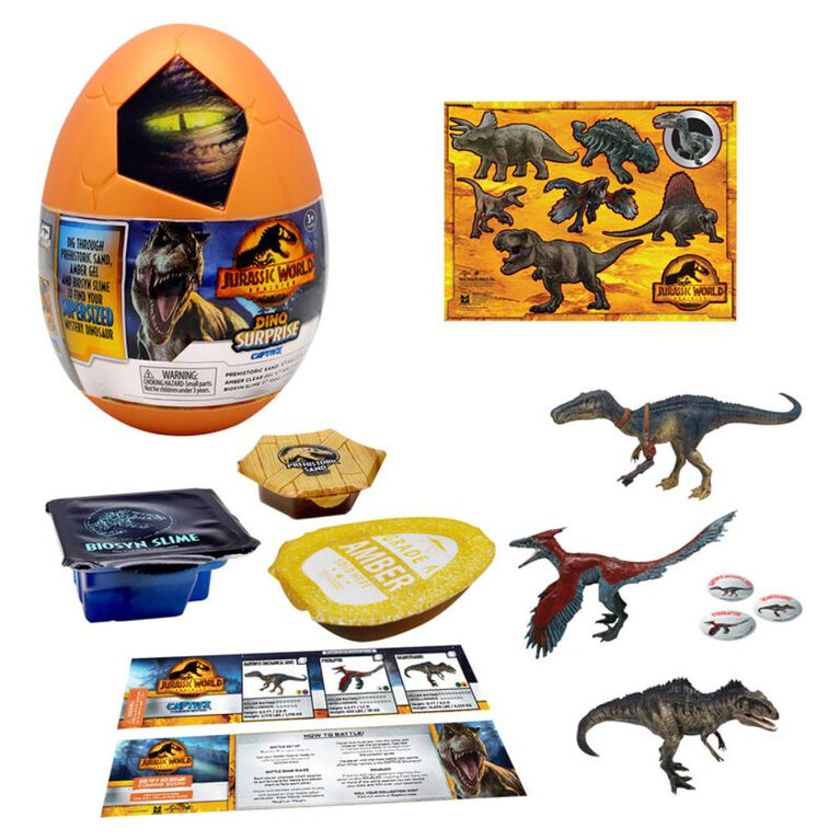 Crack open your Captivz Dominion Surprise Egg to discover super-sized Pop N Lock dinosaurs from the Jurassic World Dominion movie! DIG through pre-historic sand, SLICE through amber sap and OOZE through BioSyn lab slime to discover which super-sized exclusive species you have unearthed! Collect them all and get ready for the ULTIMATE BATTLE! Suitable from 3 years.