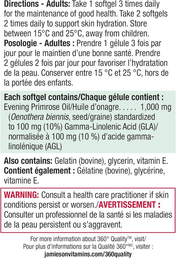 Jamieson Evening Primrose Oil 1,000 mg, Omega-6, Supports Skin Hydration, Skin Smoothness, Reduces Acne Symptoms, and Provides Ezcema Symptom Support. Non-GMO, Gluten-Free, 85 Softgels, Proudly Canadian