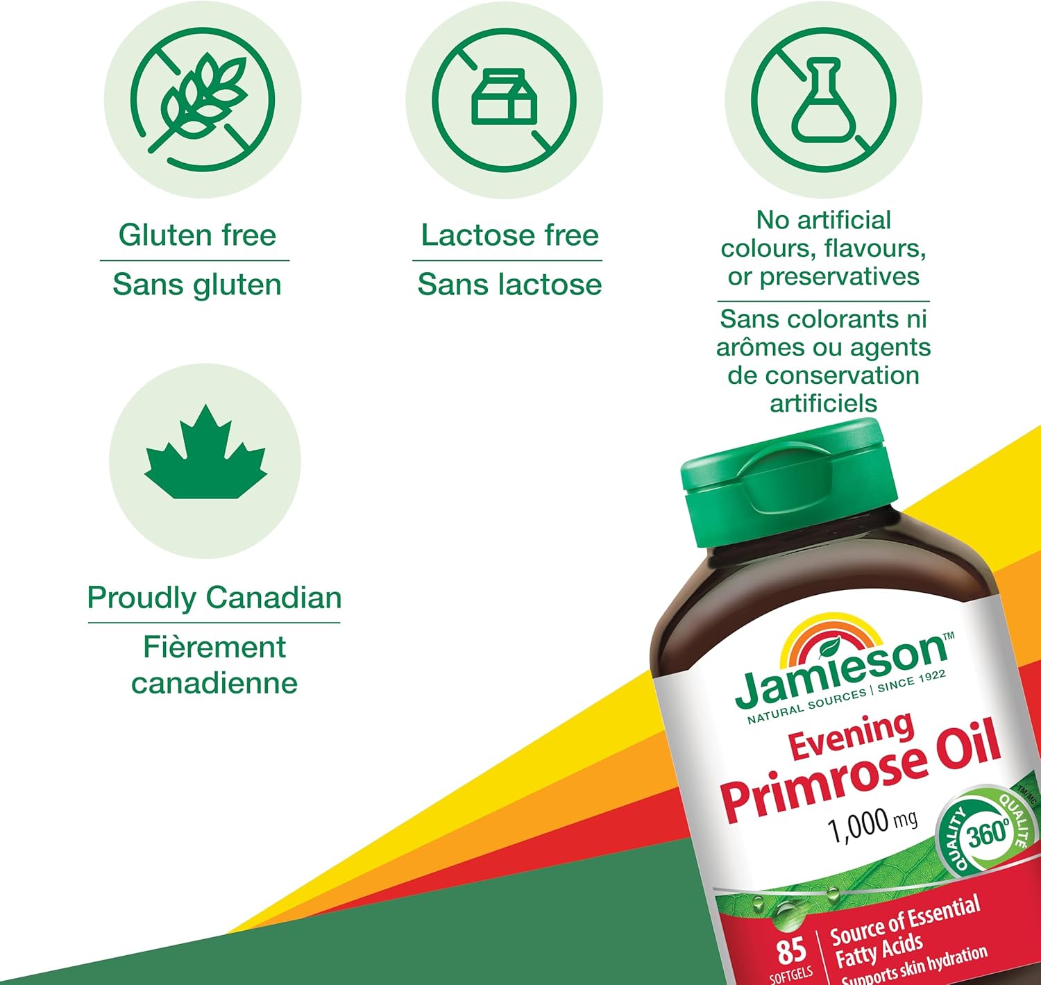 Jamieson Evening Primrose Oil 1,000 mg, Omega-6, Supports Skin Hydration, Skin Smoothness, Reduces Acne Symptoms, and Provides Ezcema Symptom Support. Non-GMO, Gluten-Free, 85 Softgels, Proudly Canadian