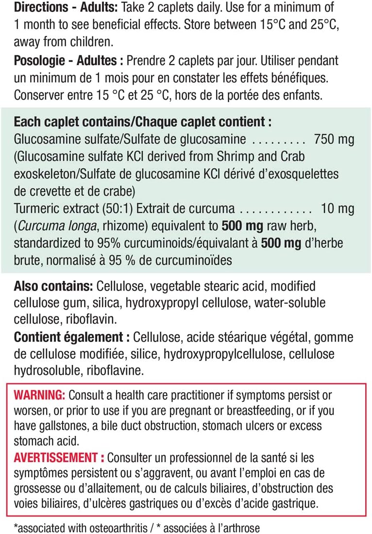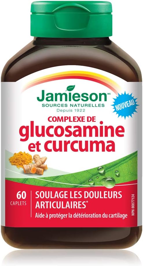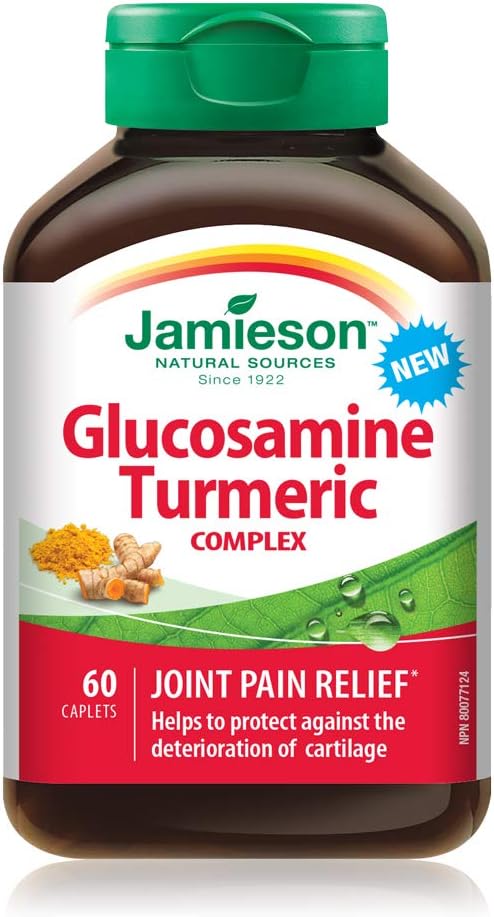 Jamieson Glucosamine Turmeric Complex, with 750 mg Glucosamine and 500 mg Turmeric, Anti-inflammatory, Provides Joint Pain Relief and Digestive Support. Gluten-Free, 60 Caplets, Proudly Canadian