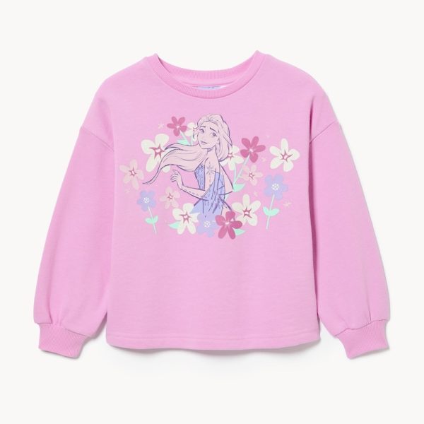 A swirl of flowers and feel-good comfort. This toddler girls’ Disney Frozen Elsa sweatshirt is made of terry to keep her warm on breezy days, whether she’s watching her favourite movies or playing with her friends. Dropped shoulders create an oversized fit, while the front graphic print with glittery accents adds sparkle to her style.