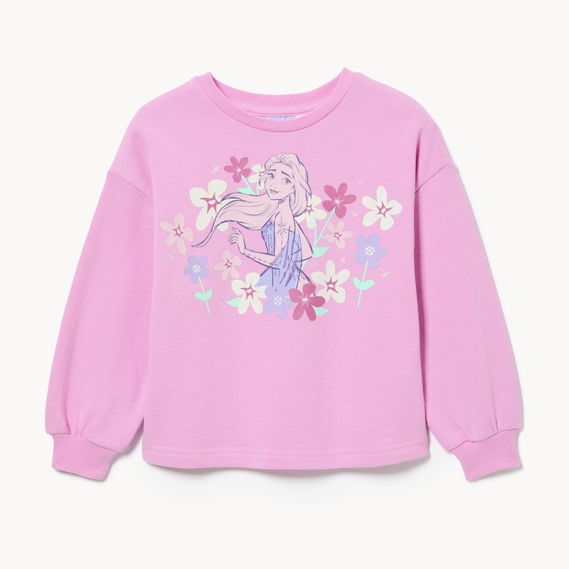 A swirl of flowers and feel-good comfort. This toddler girls’ Disney Frozen Elsa sweatshirt is made of terry to keep her warm on breezy days, whether she’s watching her favourite movies or playing with her friends. Dropped shoulders create an oversized fit, while the front graphic print with glittery accents adds sparkle to her style.