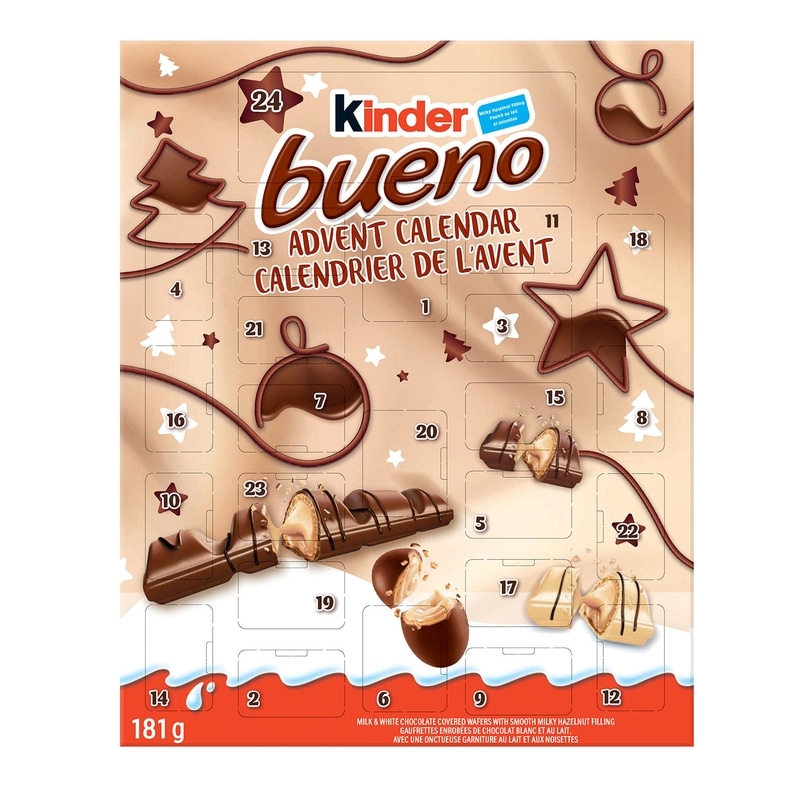 - The KINDER BUENO 2025 Advent Calendar is a delicious way to start the holiday countdown. Behind each window is a tasty treat to enjoy every day until December 25th.