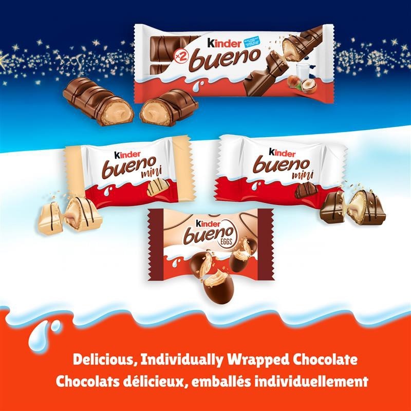 - Featuring KINDER BUENO mini in two (2) flavours: Milk and White chocolate as well as KINDER BUENO EGGS. Also includes one (1) full size pack (43g) of KINDER BUENO, containing two (2) individually wrapped bars per pack.