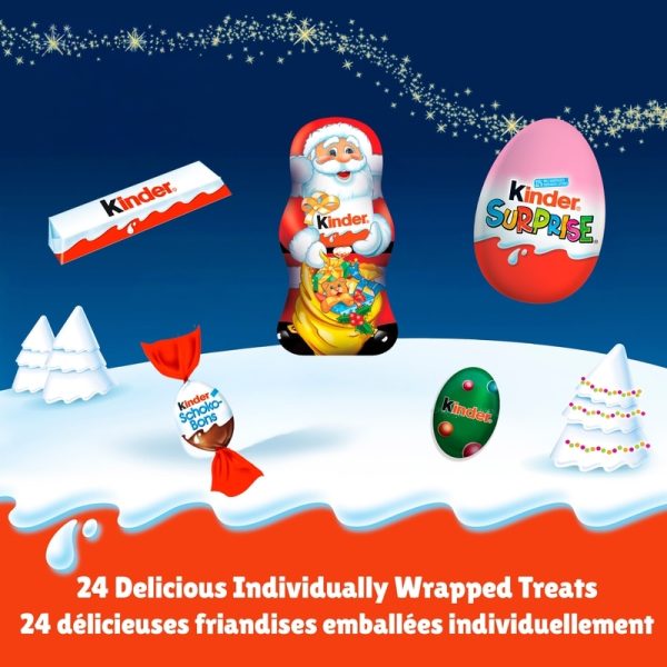 - DELICIOUS TREATS: Featuring KINDER SURPRISE, KINDER CHOCOLATE/CHOCOLAT, KINDER SCHOKO-BONS, KINDER MINI EGGS, KINDER Hollow Santa.