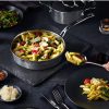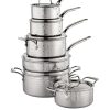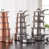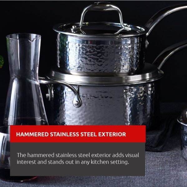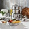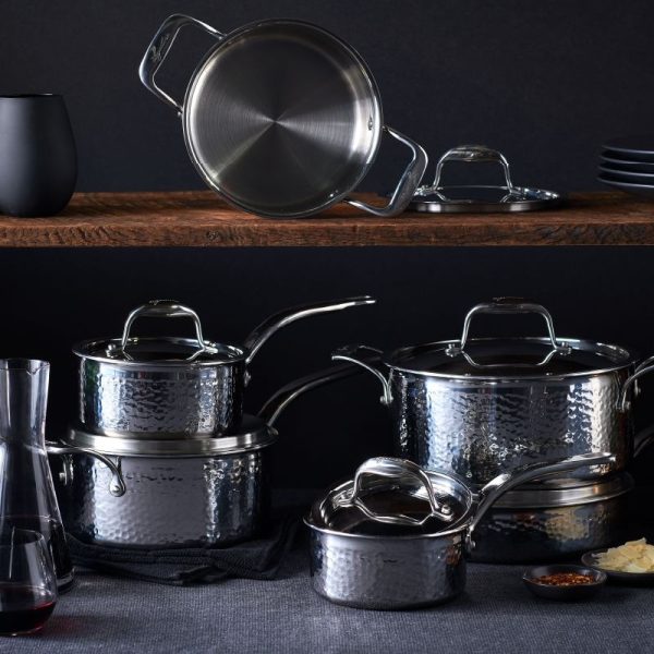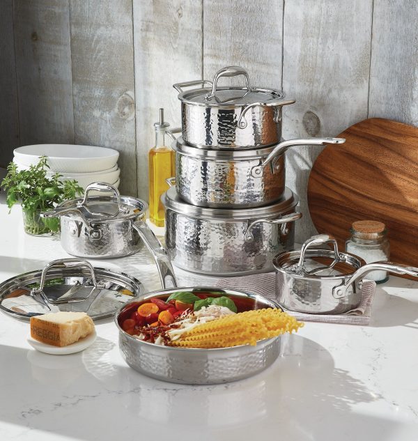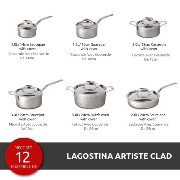 The Lagostina Artiste-Clad Hammered Stainless Steel Cookware Set brings artful elegance to any kitchen. The thick aluminum core provides superior even heating, the hammered stainless steel exterior adds visual interest and durability, and the premium stainless steel interior is hygienic and non-porous. Riveted hollow cast handles allow for a sturdy grip and this set is oven safe up to 204°C. This versatile 12-piece cookware set includes two saucepans, a casserole, a sauce pot, a Dutch oven, and a sauté pan, all with lids.