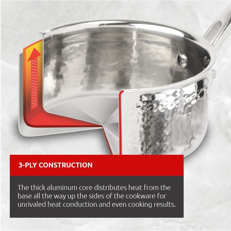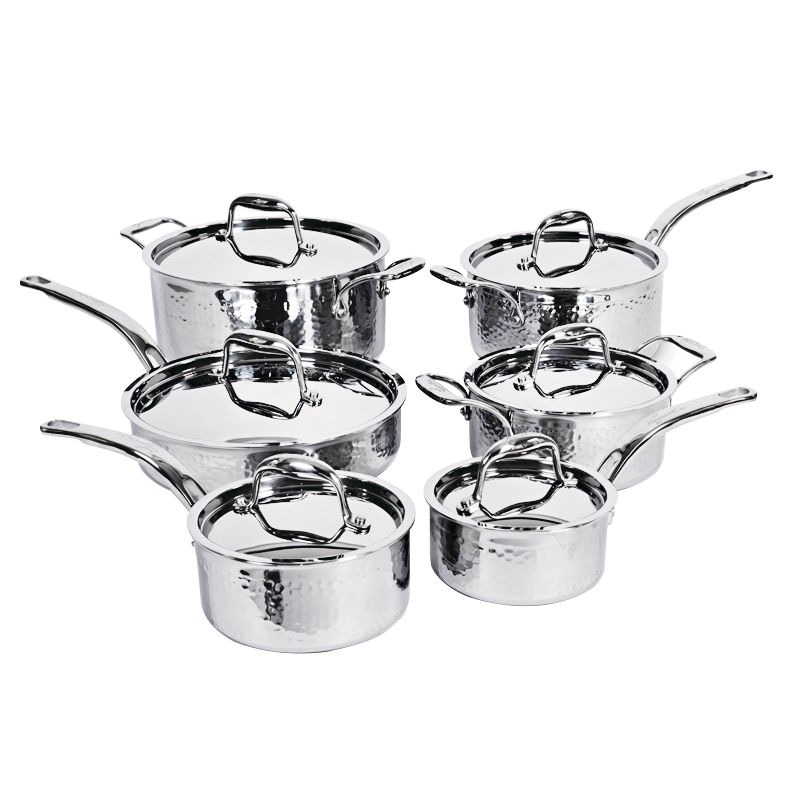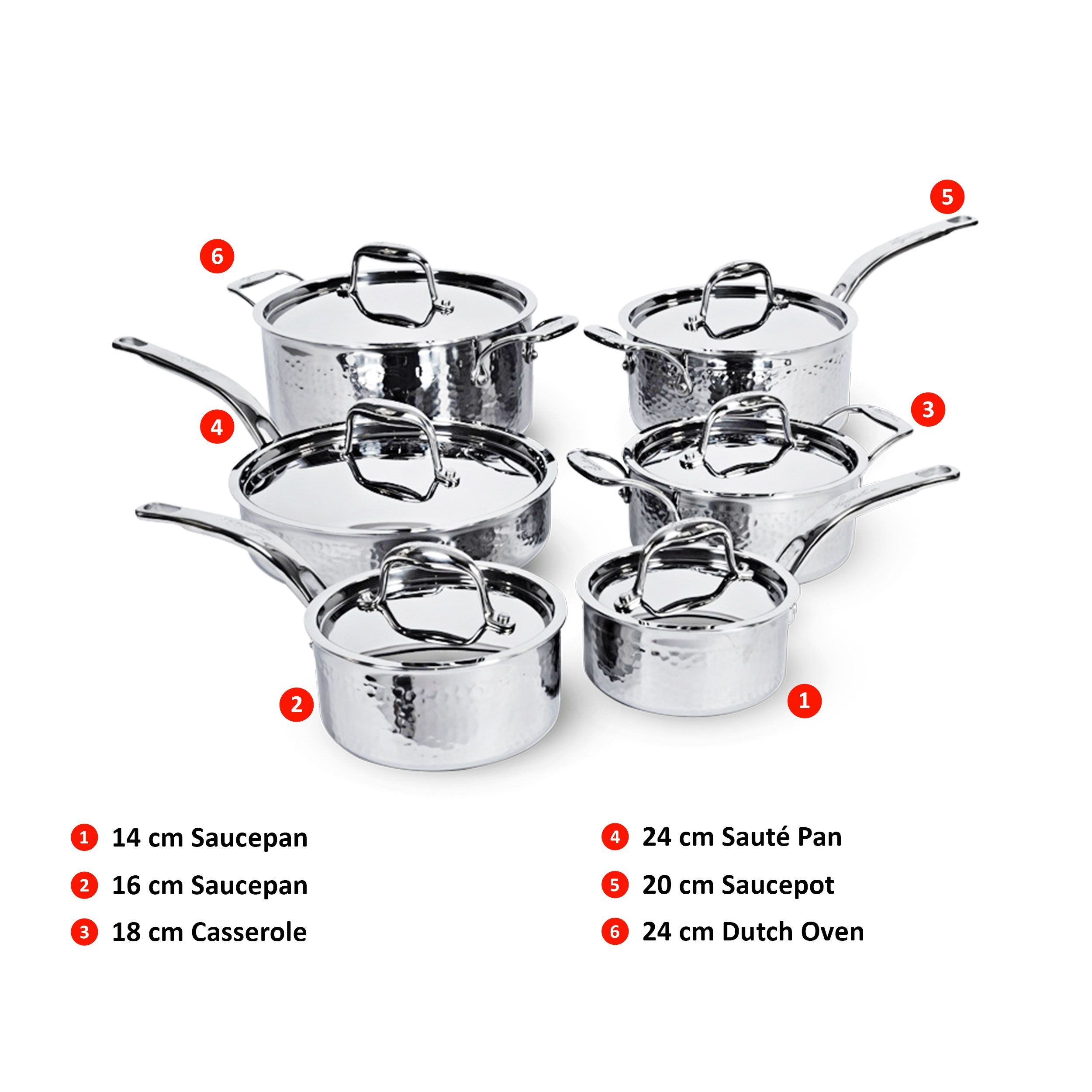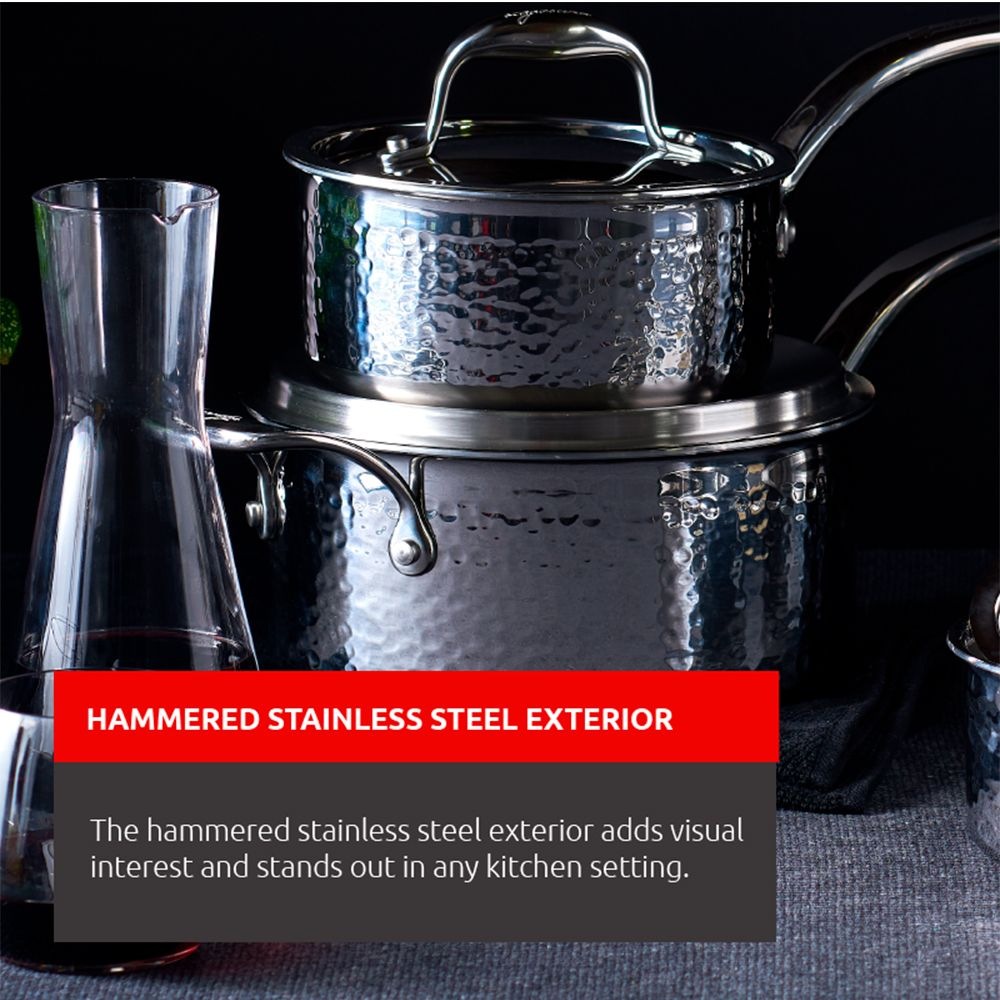 The Lagostina Artiste-Clad Hammered Stainless Steel Cookware Set brings artful elegance to any kitchen. The thick aluminum core provides superior even heating, the hammered stainless steel exterior adds visual interest and durability, and the premium stainless steel interior is hygienic and non-porous. Riveted hollow cast handles allow for a sturdy grip and this set is oven safe up to 204°C. This versatile 12-piece cookware set includes two saucepans, a casserole, a sauce pot, a Dutch oven, and a sauté pan, all with lids.