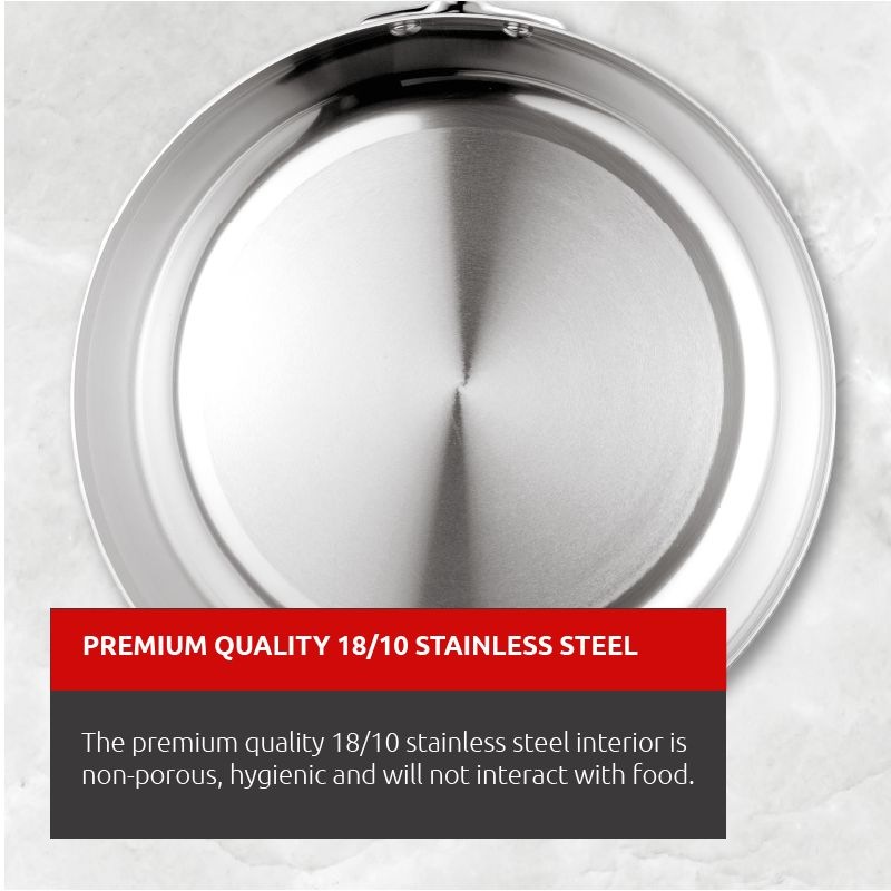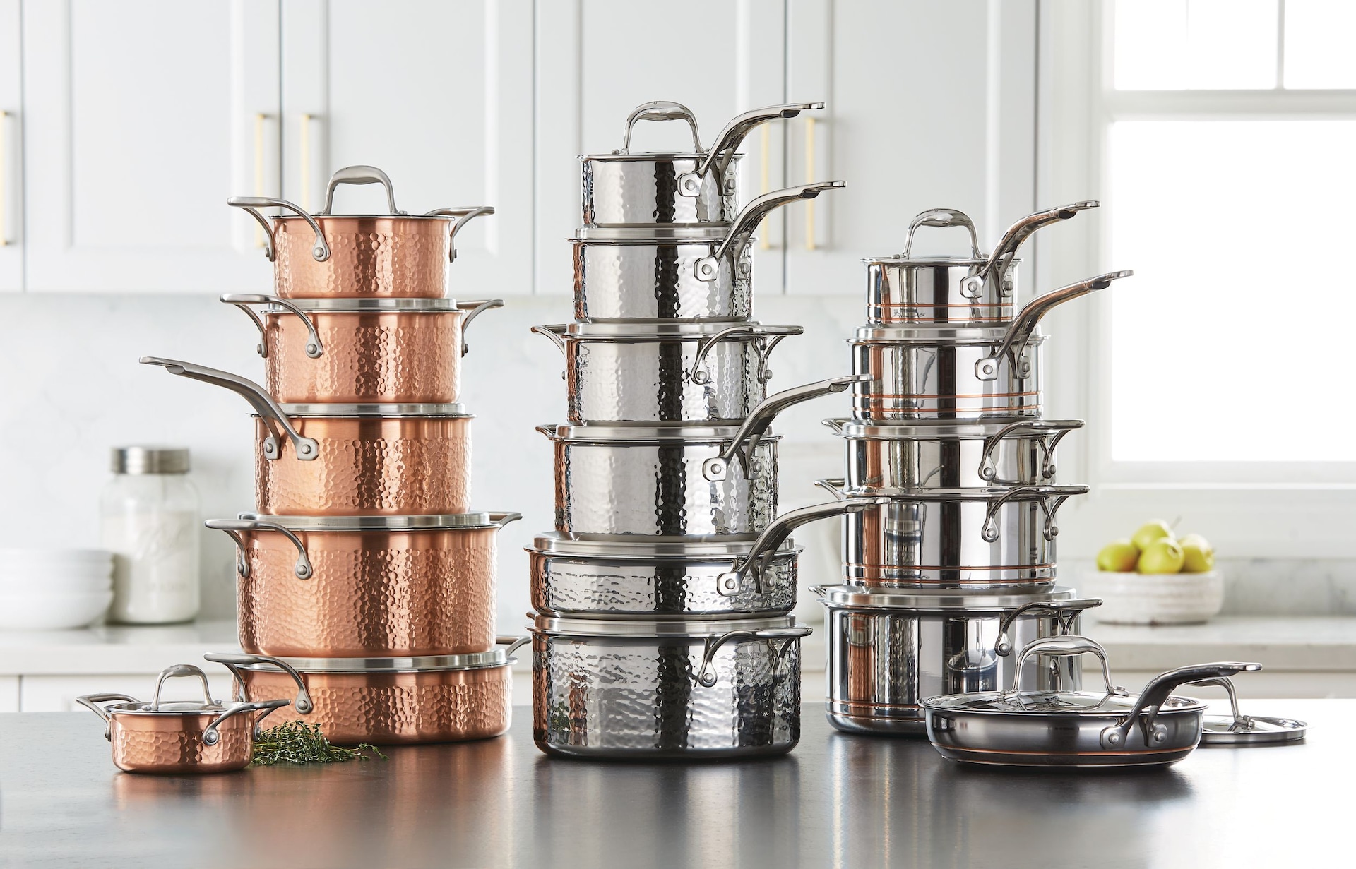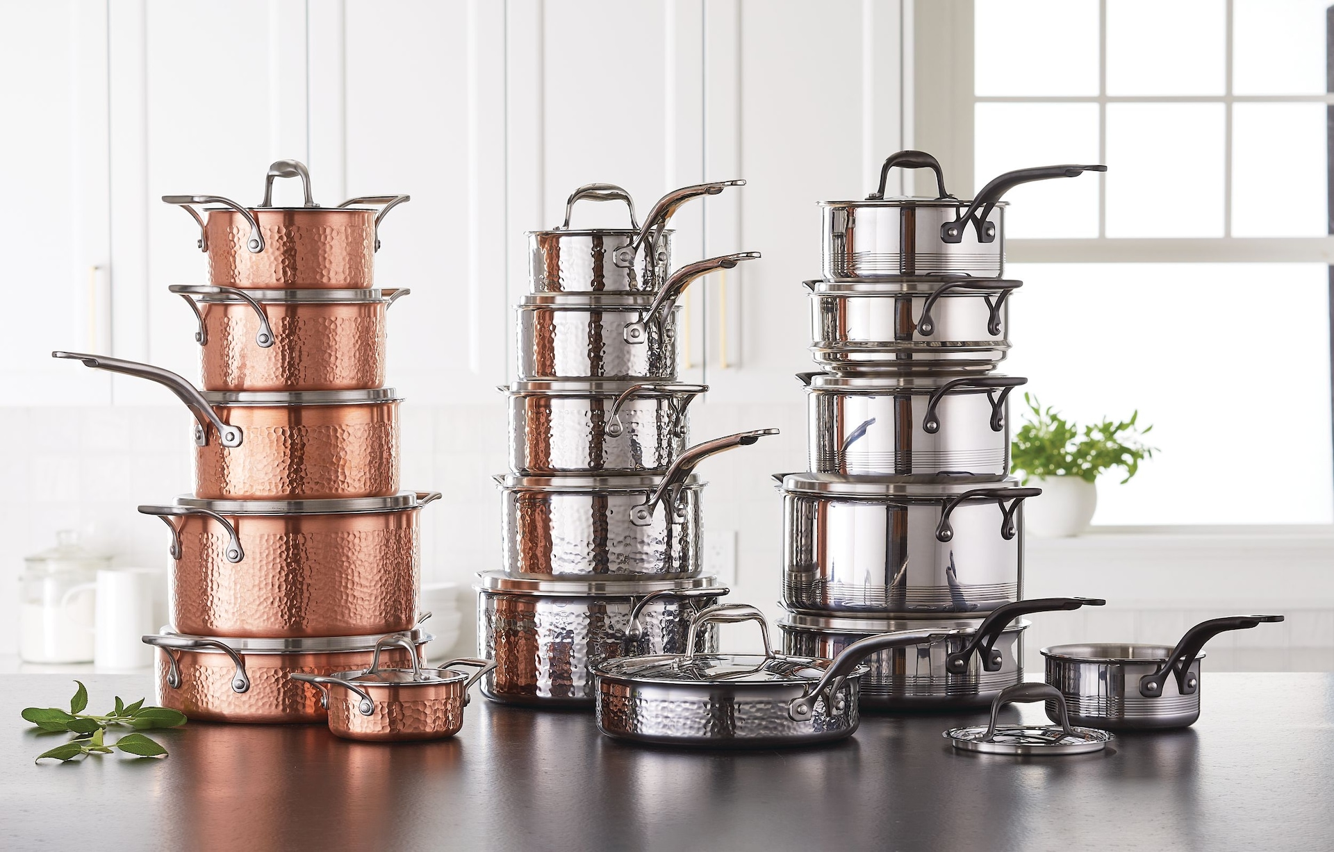 The Lagostina Artiste-Clad Hammered Stainless Steel Cookware Set brings artful elegance to any kitchen. The thick aluminum core provides superior even heating, the hammered stainless steel exterior adds visual interest and durability, and the premium stainless steel interior is hygienic and non-porous. Riveted hollow cast handles allow for a sturdy grip and this set is oven safe up to 204°C. This versatile 12-piece cookware set includes two saucepans, a casserole, a sauce pot, a Dutch oven, and a sauté pan, all with lids.