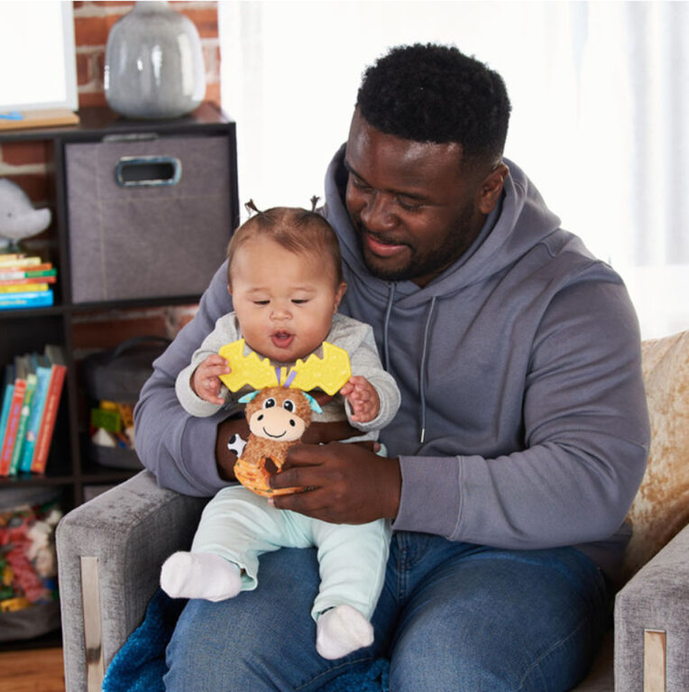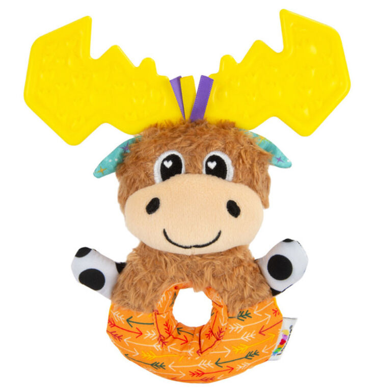The Lamaze Mortimer Moose Rattle brings fun to baby both at home and on the run! This developmental toy features crinkle and jingle sounds to engage baby’s attention and stimulate auditory development. These fun sounds make grabbing and squeezing Mortimer more fun! The ideal size for babies to grab and hold, the rattle is great for promoting fine motor skill development. Babies explore with their mouth as well as their hands and Mortimer features textured antlers that are great for chewing. The high contrast patterns and bright colors also provide your baby with visual stimulation during play time. At a size that’s great for on the go, you can easily toss this friendly animal rattle into the diaper bag for fun where ever you go.
