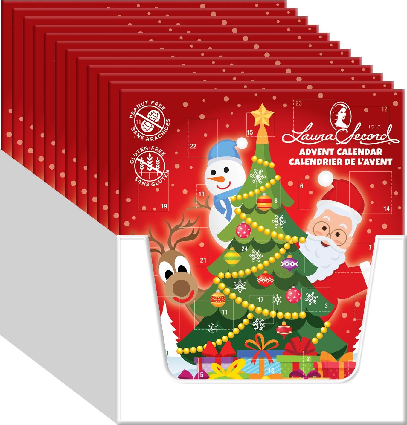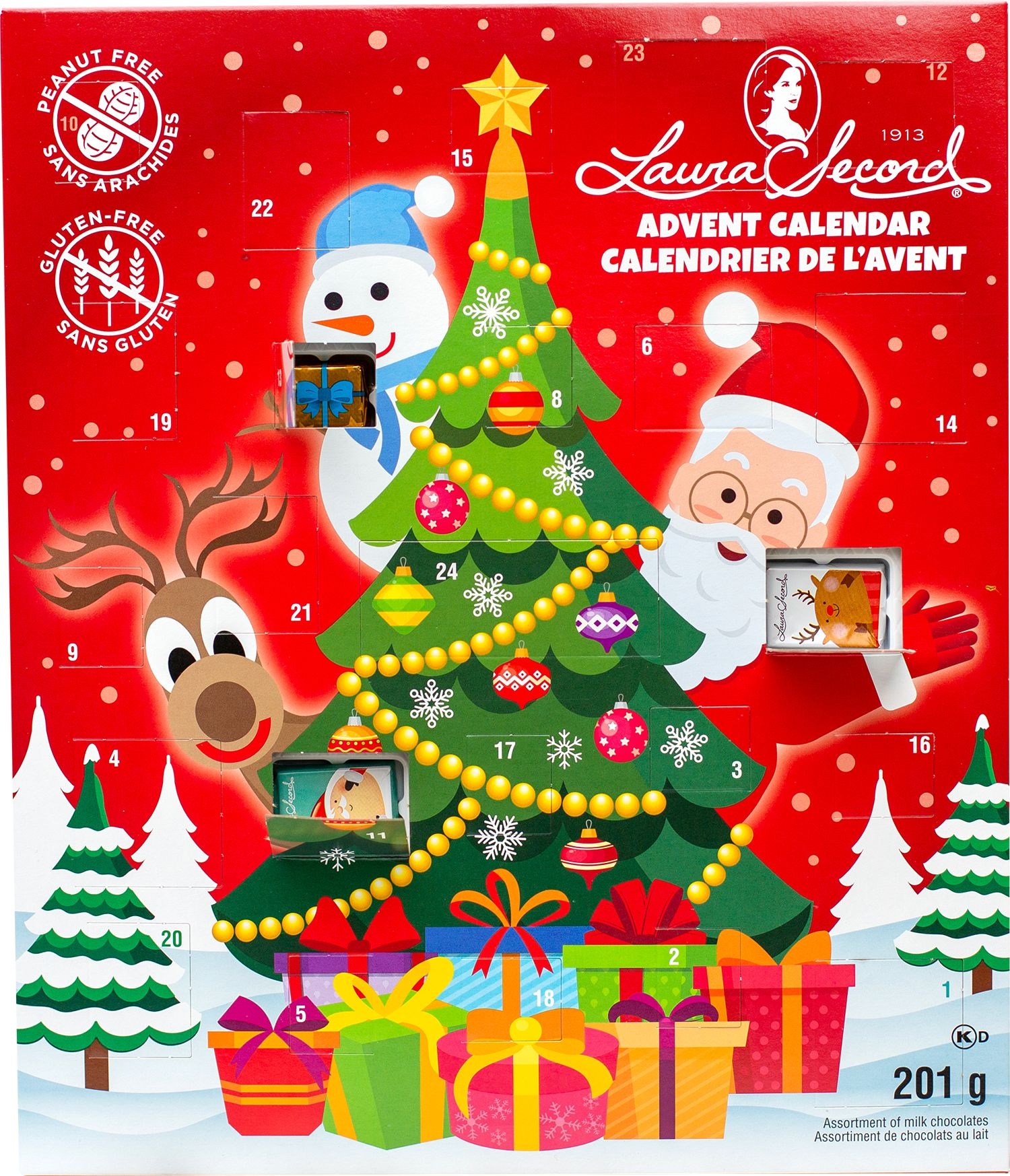 Celebrate the holiday season with the Laura Secord Peanut Free Advent Calendar. Each day reveals a delightful milk chocolate treat, making it a perfect choice for those with peanut allergies. Enjoy the festive countdown with pure, delicious chocolates prepared in Canada.