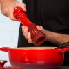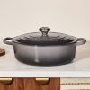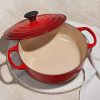 The Shallow Round Dutch Oven provides a spacious cooking surface for searing large batches of meat and can even be used for simmering sauces, thanks to its tall sides. Its tight-fitting lid locks in heat, while its sand-colored enamel allows you to easily monitor the progress of recipes as they slow cook.