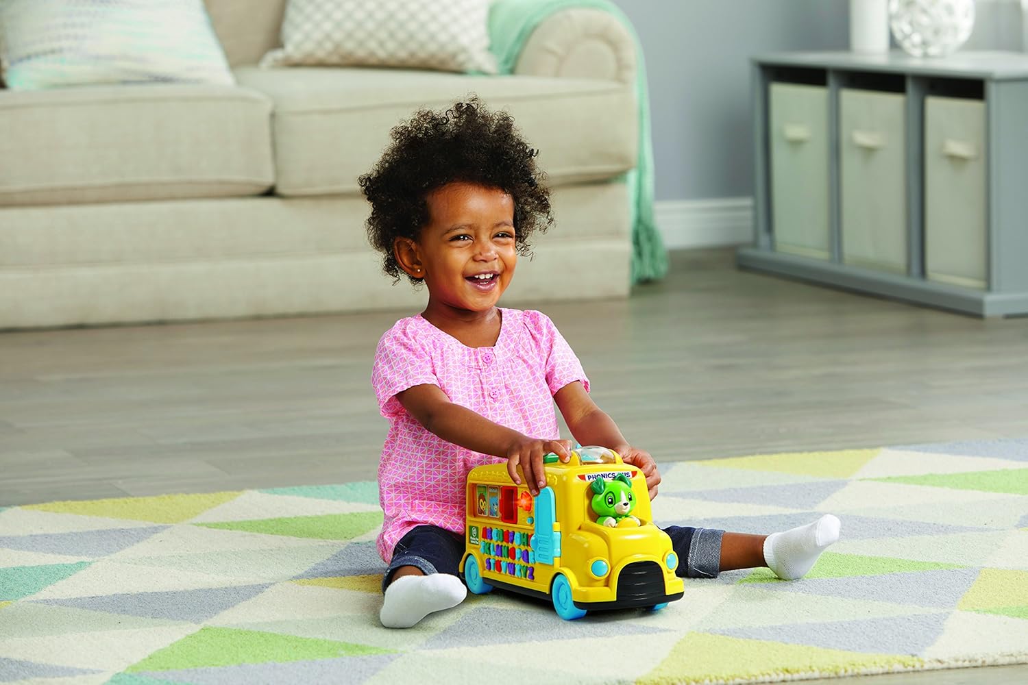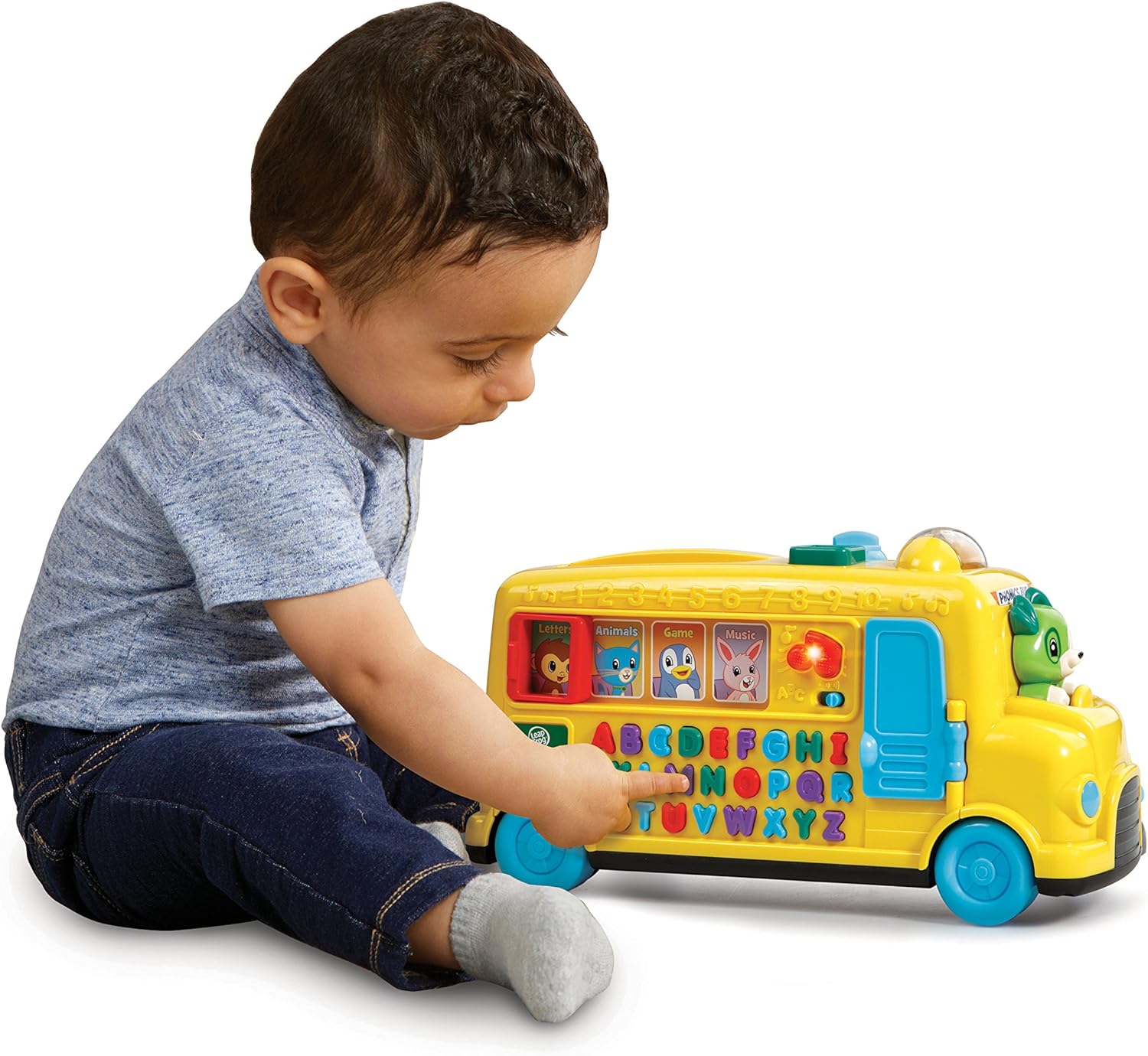 - Scout drives a bright yellow school bus featuring 26 colorful letter buttons that come alive with unique and silly personalities.