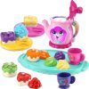 - Brew fruit tea by lifting the lid to select a flavor and the teapot will change color; play peek-a-boo and smile in the mirror
