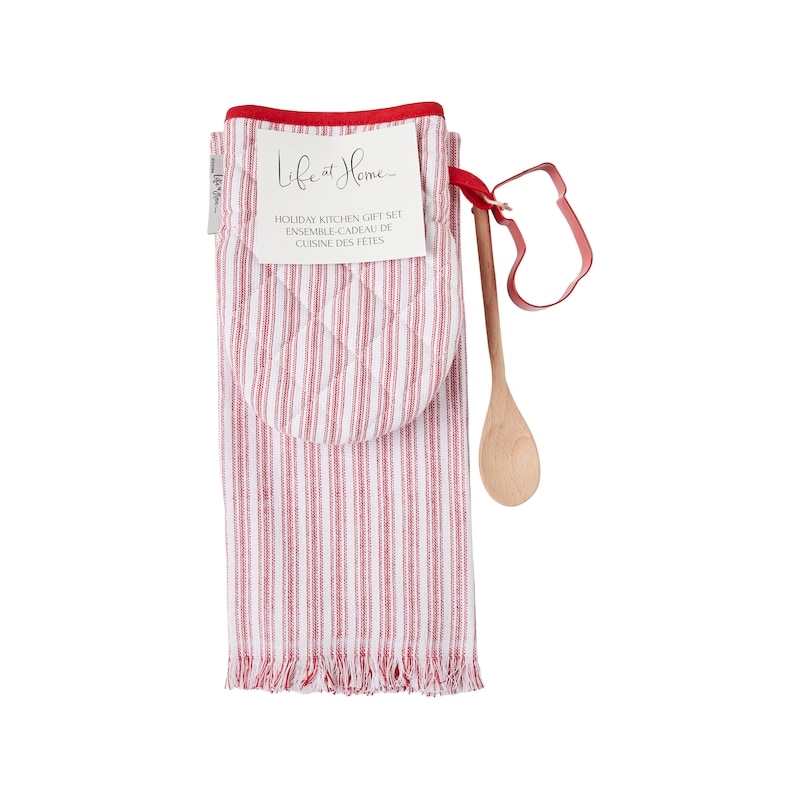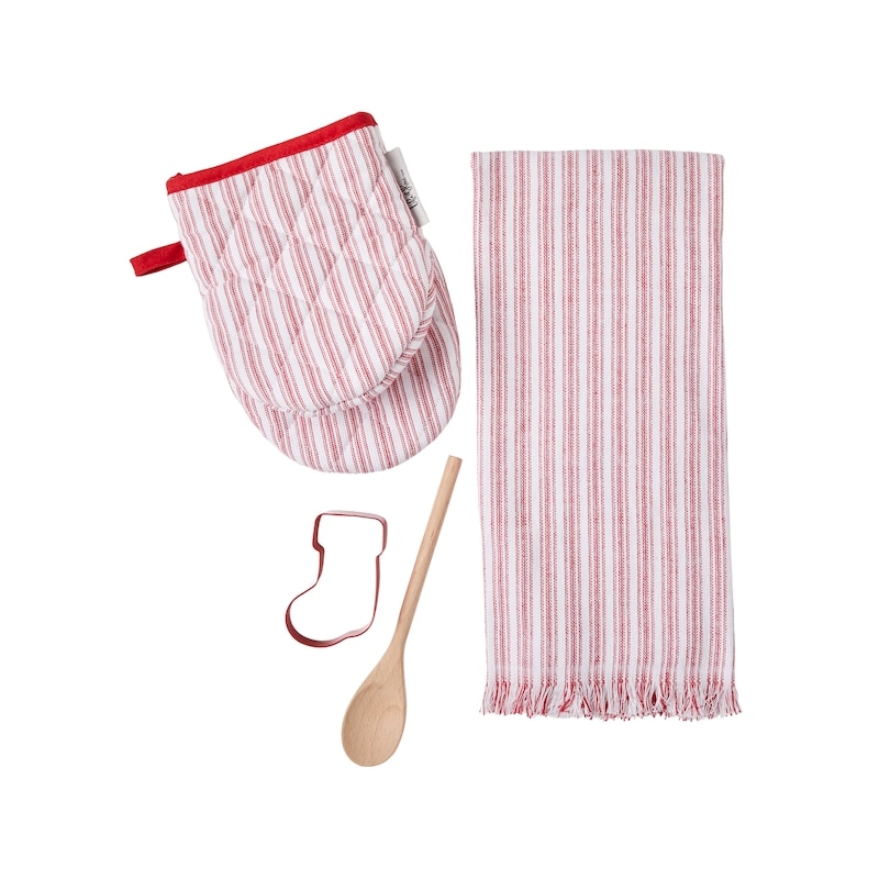 Our Holiday Kitchen Gift 4 Piece Set is great for gifting to family or friends this festive season. It includes a cotton mini mitt, cotton hammam towel, wooden spoon, and stainless steel cookie cutter. This set is perfect for baking everything from cakes to cookies.