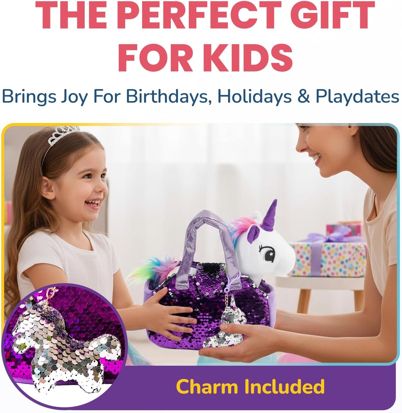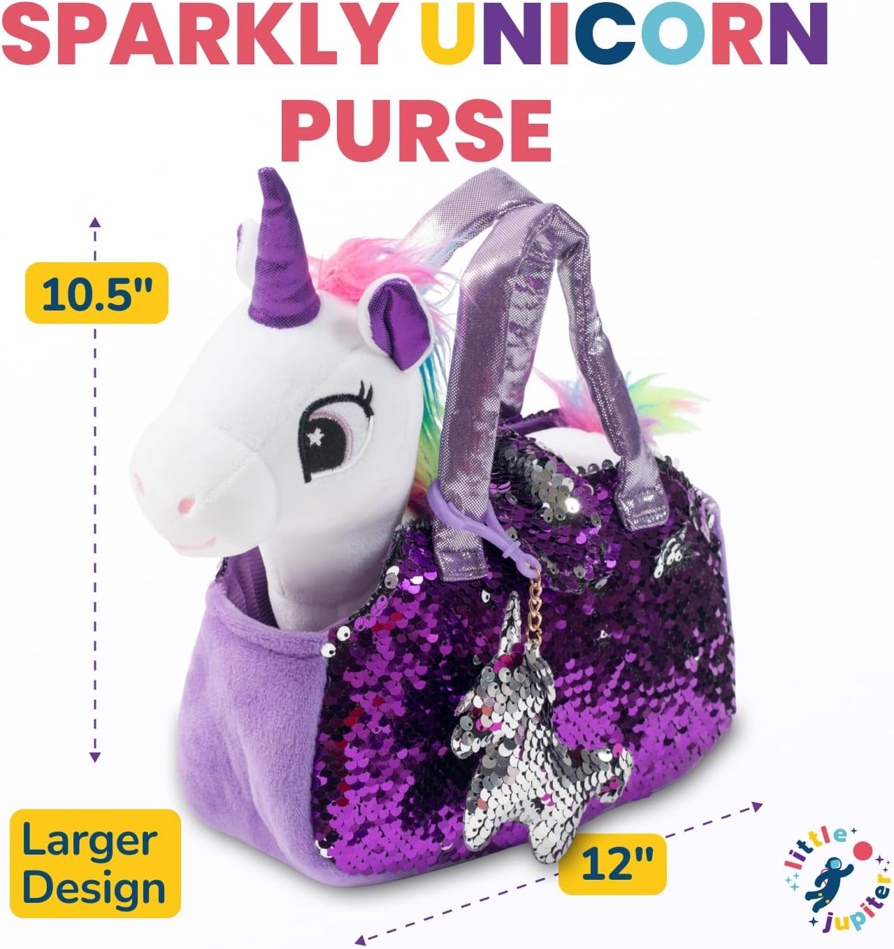 - Complete 3 Piece Plush Unicorn Playset: Includes stuffed toy unicorn, sparkling carrier purse bag with reversible sequins, and charm. The perfect unicorn plush toys for girls.