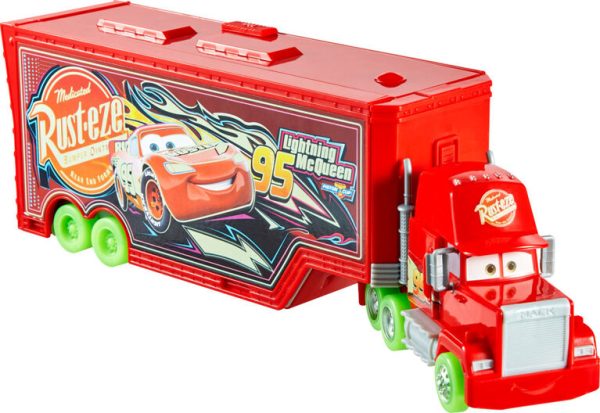 Ready, set, GLOW! With this brilliant version of Disney and Pixar’s Cars Glow Racers Transforming Mack playset, kids can light up playtime with glow-in-the-dark elements and twice the fun. This toy truck does double duty as a push-around hauler and a fold-out playset for tune-ups. Open Mack’s trailer to reveal Guido, ready to tune-up racers’ tires before the next race! When ready, close everything up and head back out on the road — just push to reach the next destination. Mack hauler has glow-in-the-dark detailed deco inspired by his movie look that fans will love. Kids can recreate favorite scenes and make up new adventures as they let their imaginations wander the open road! Colors and decorations may vary.