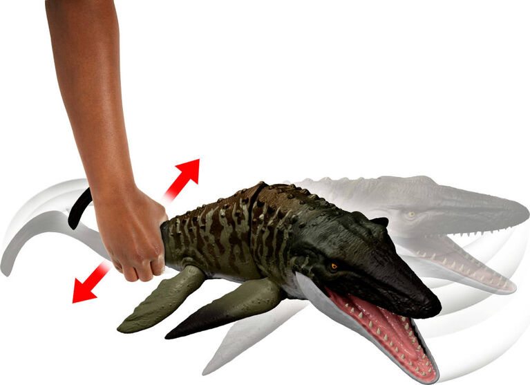 This Bite ‘N Blast Mosasaurus dinosaur action figure with its distinctive aquatic design brings the excitement of Jurassic World Rebirth home. A button-activated ‘Bite’ feature allows dramatic re-enactment of movie scenes and inspires creative play. Kids can control the attack by holding the tail and pressing the button to make the jaw open wide to bite the mini Dilophosaurus figure that’s included can be completely ‘swallowed’ into the large Mosasaurus body! Press the button again to ‘Blast’ the prey back out! With movable joints and movie-accurate design on the 25.7-inch long Mosasaurus, it’s ready for both play and display. Scan the Tracking Code under the fin in the free Jurassic World Play App with a compatible smart device (Android or iOS, not included) to unlock a digital version of the dinosaur and play the fiercely fun game to race various vehicles on land, air and sea. Makes a great gift for dinosaur fans ages 4 years and up. Colors and decorations may vary.
