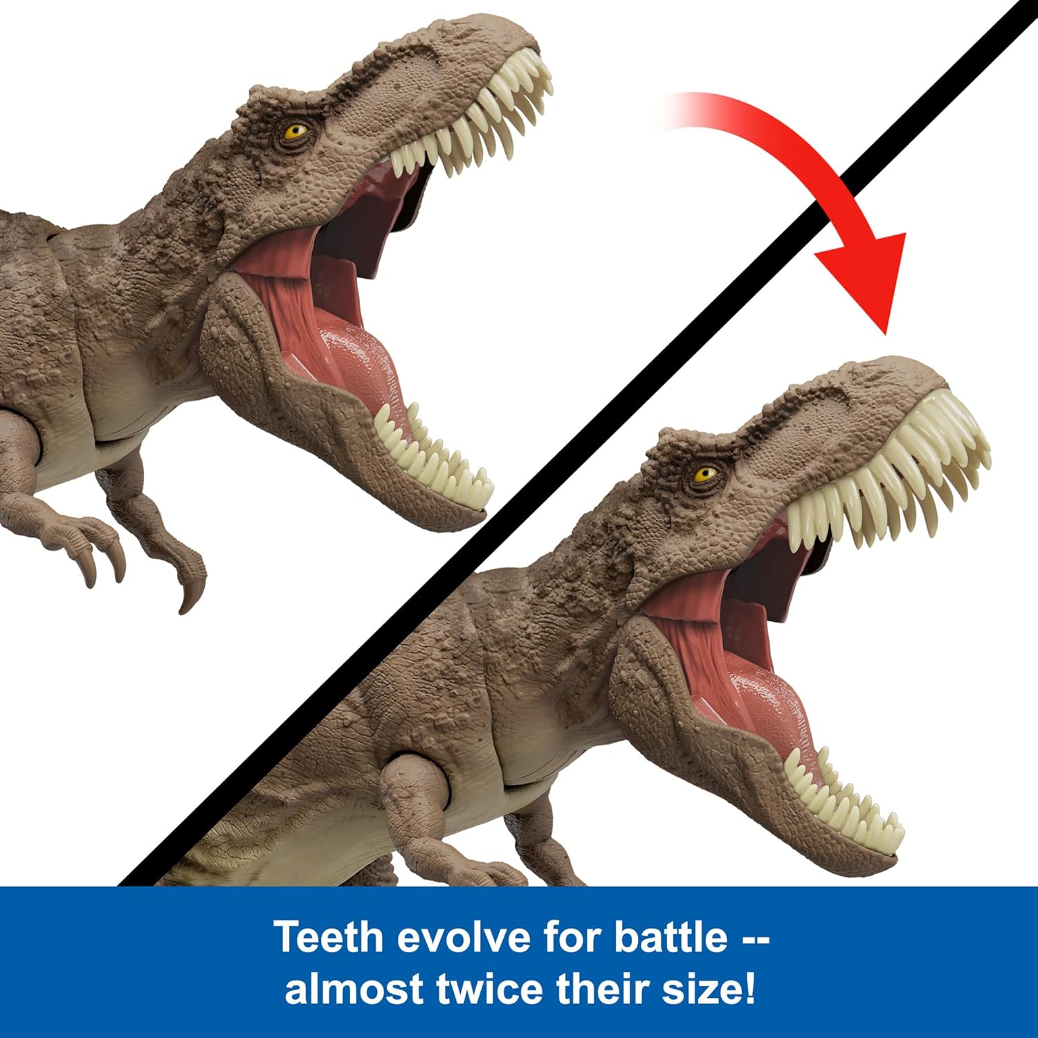 This All-Out Attack Tyrannosaurus rex gives rampage attack and ‘evolved for battle’ features to the most iconic species of them all. This action figure’s rampage attack is a dramatic up and down neck thrash, along with a chomp action and roar sounds. The faster the button is pressed, the bigger the roars and chomps! This T. rex is also ‘evolved for battle’ with teeth that grow to almost 2 times their size! Scan the hidden Tracking Code in the free Jurassic World Play App with a compatible smart device (Android or iOS, not included) to unlock a digital version of the dinosaur and access to fiercely fun games! Colors and decorations may vary.