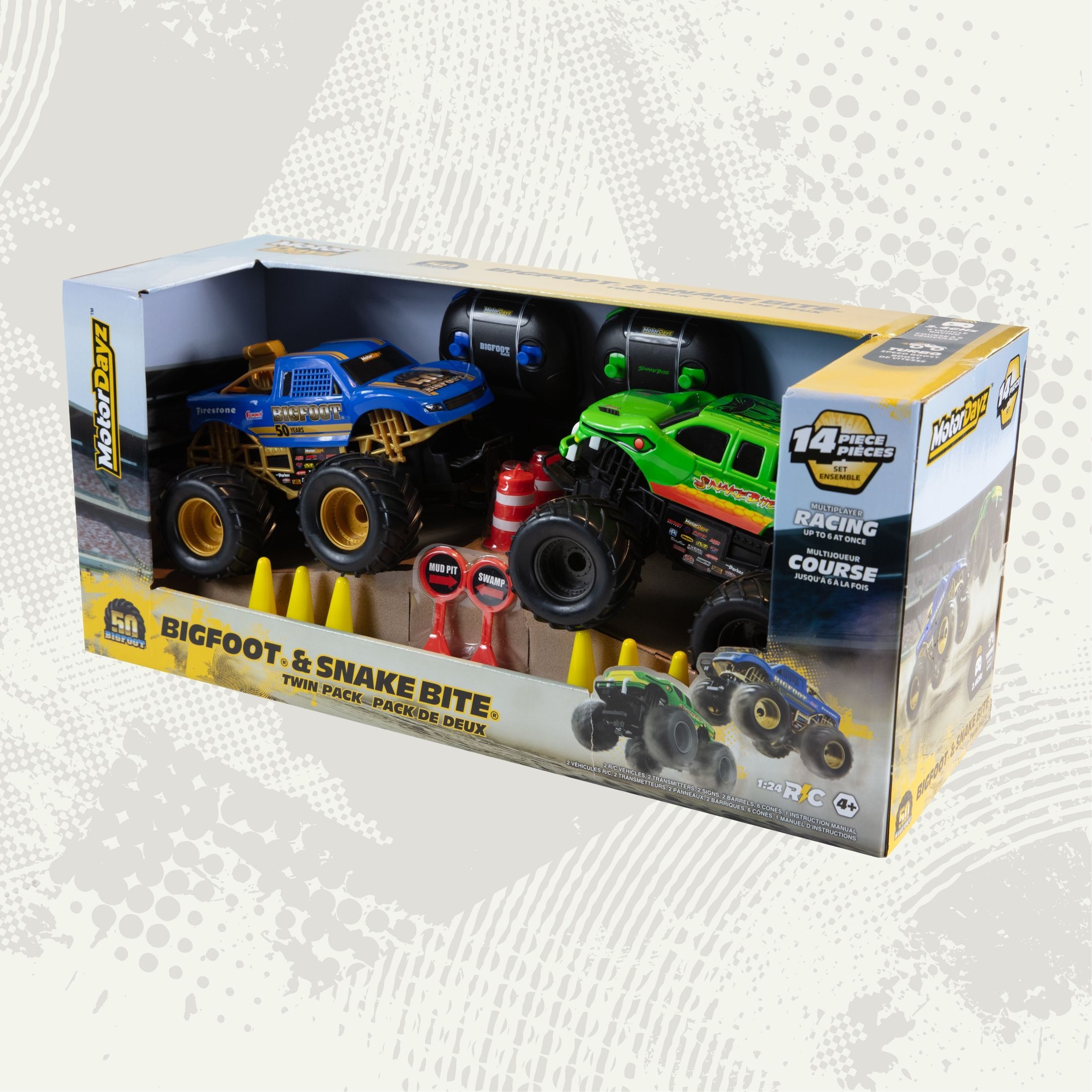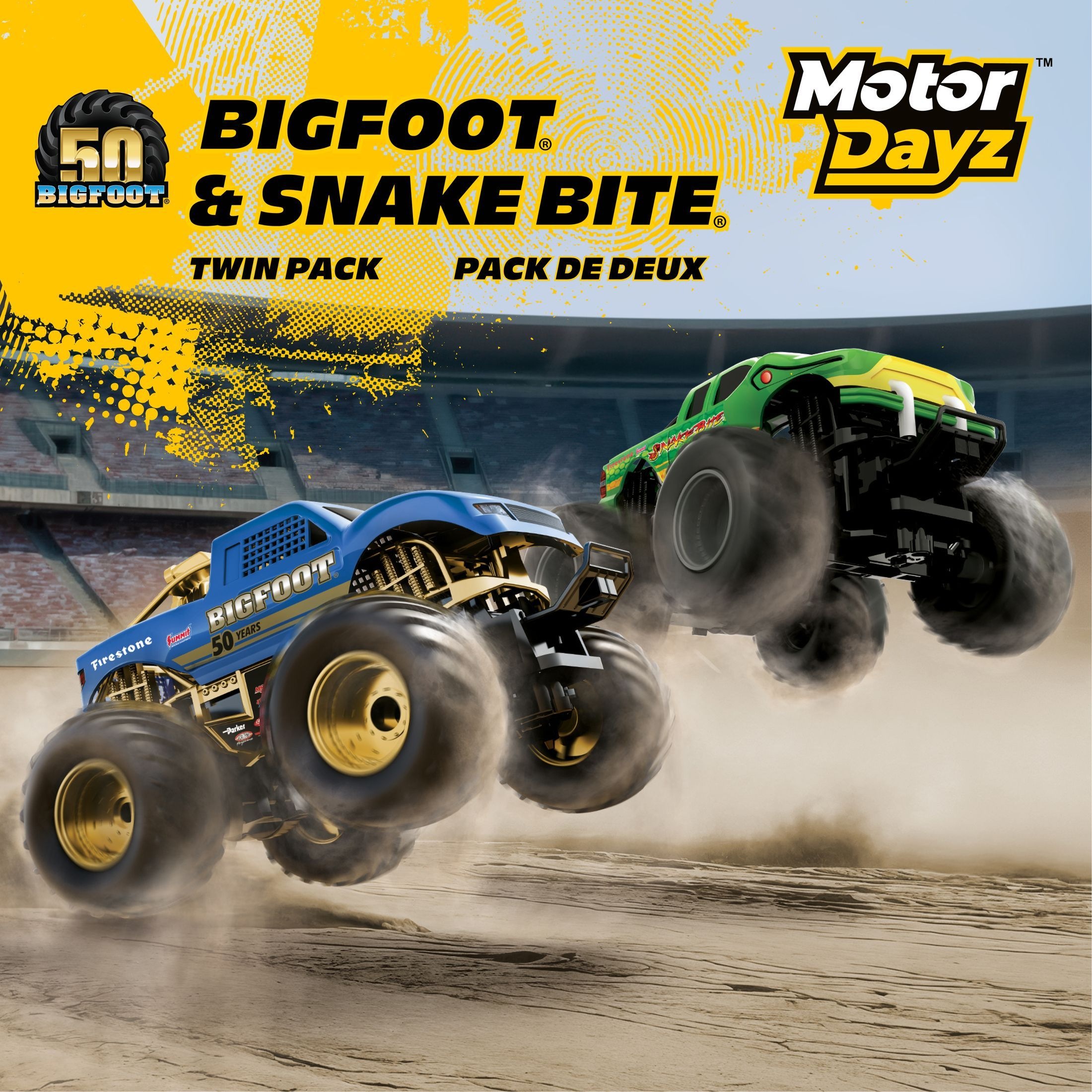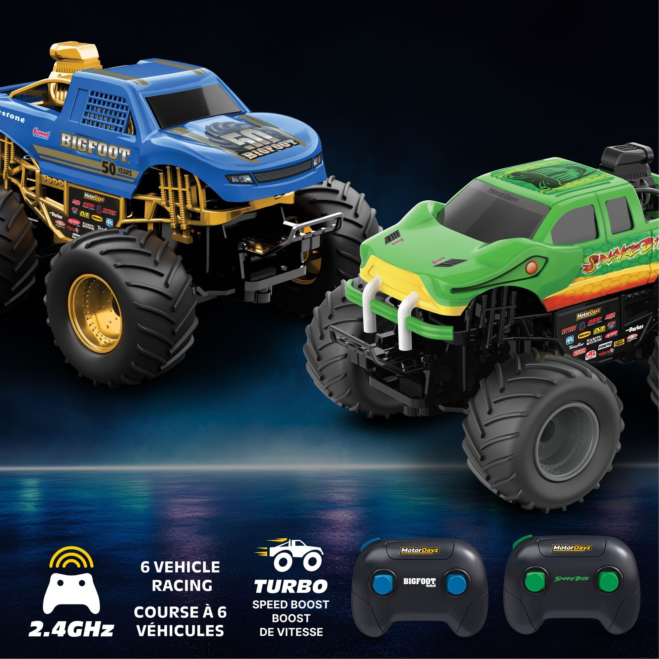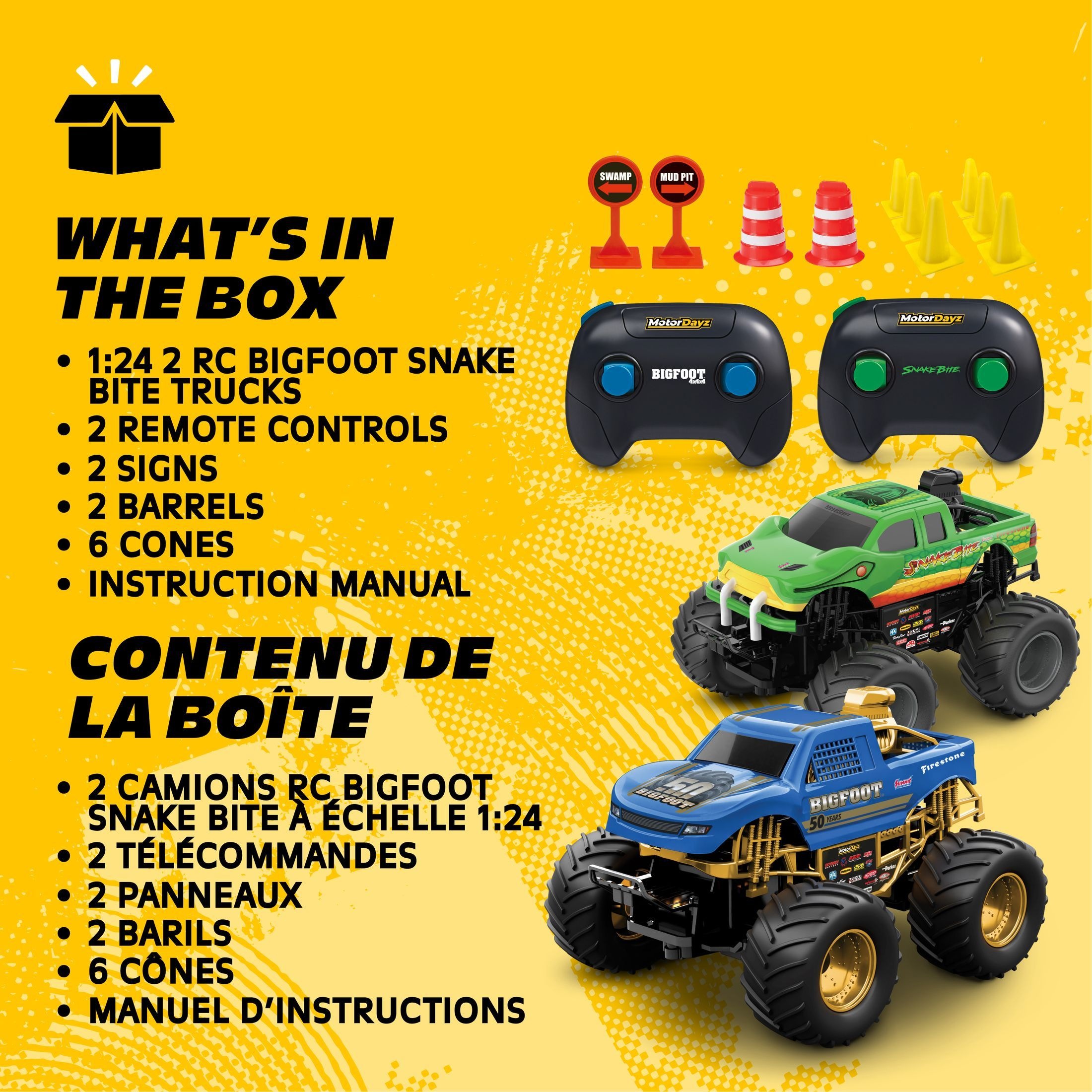 1:24 Bigfoot Monster Truck Twin Pack – Full Function Radio Control. Left, Right, Forward, and Reverse Steering. MotorDayz 1:24 scale full function monster truck twin pack has the features of 2 officially licensed Bigfoot Monster Trucks, The Original Bigfoot and Snake Bite. Features include grippy non-marking tires, 2 speed turbo control, and monster truck arena accessories. This twin pack is built for all types of chidlren play and is great for indoor and outdoor locations. The game-grip style transmitter fits in all hands and has a built in turbo button for accelerating on the straight aways. Connect up to six vehicles with 2.4GHz technology and race interference free. Batteries not included. Requires AA x 6 (Vehicle); 4 x 1.5V AAA (Transmitter). Includes 2 Bigfoot Monster Trucks, 2 Transmitters, and Monster Truck Arena accessories.