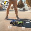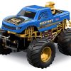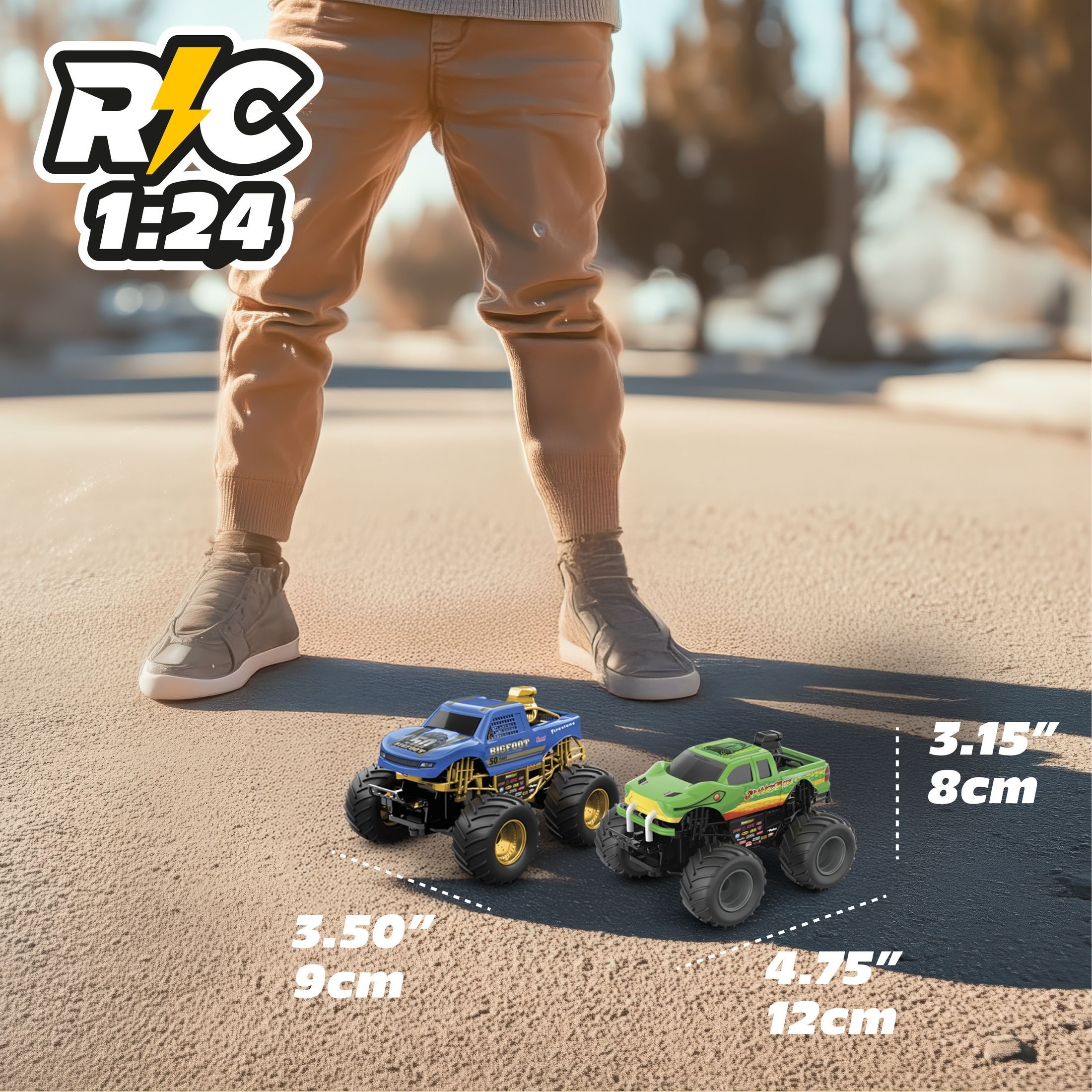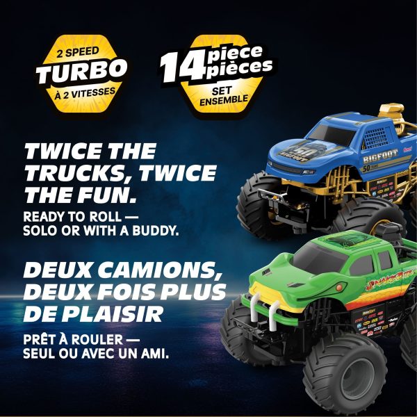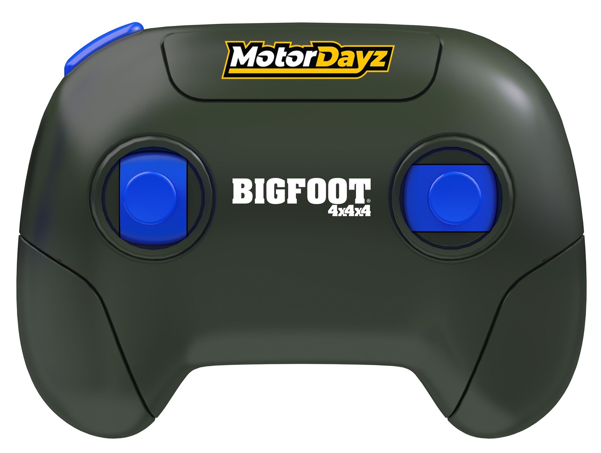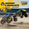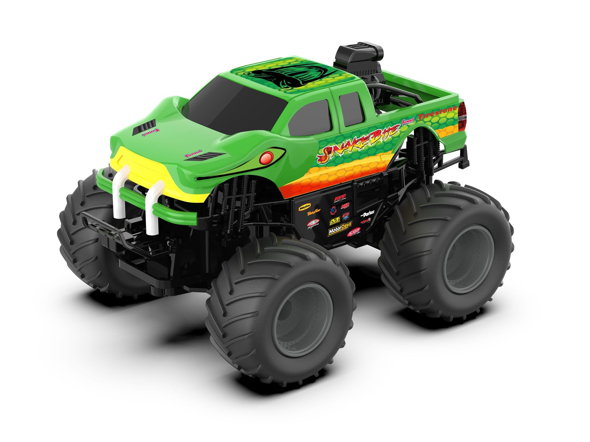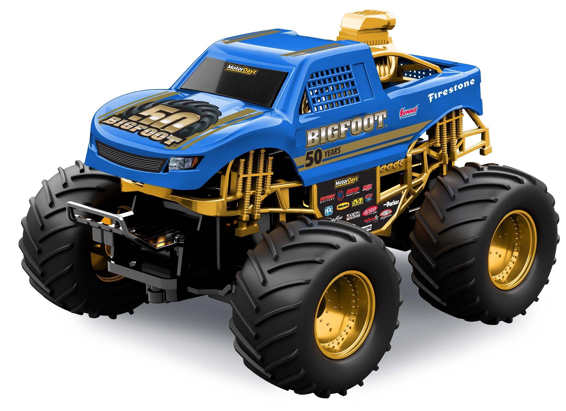 1:24 Bigfoot Monster Truck Twin Pack – Full Function Radio Control. Left, Right, Forward, and Reverse Steering. MotorDayz 1:24 scale full function monster truck twin pack has the features of 2 officially licensed Bigfoot Monster Trucks, The Original Bigfoot and Snake Bite. Features include grippy non-marking tires, 2 speed turbo control, and monster truck arena accessories. This twin pack is built for all types of chidlren play and is great for indoor and outdoor locations. The game-grip style transmitter fits in all hands and has a built in turbo button for accelerating on the straight aways. Connect up to six vehicles with 2.4GHz technology and race interference free. Batteries not included. Requires AA x 6 (Vehicle); 4 x 1.5V AAA (Transmitter). Includes 2 Bigfoot Monster Trucks, 2 Transmitters, and Monster Truck Arena accessories.