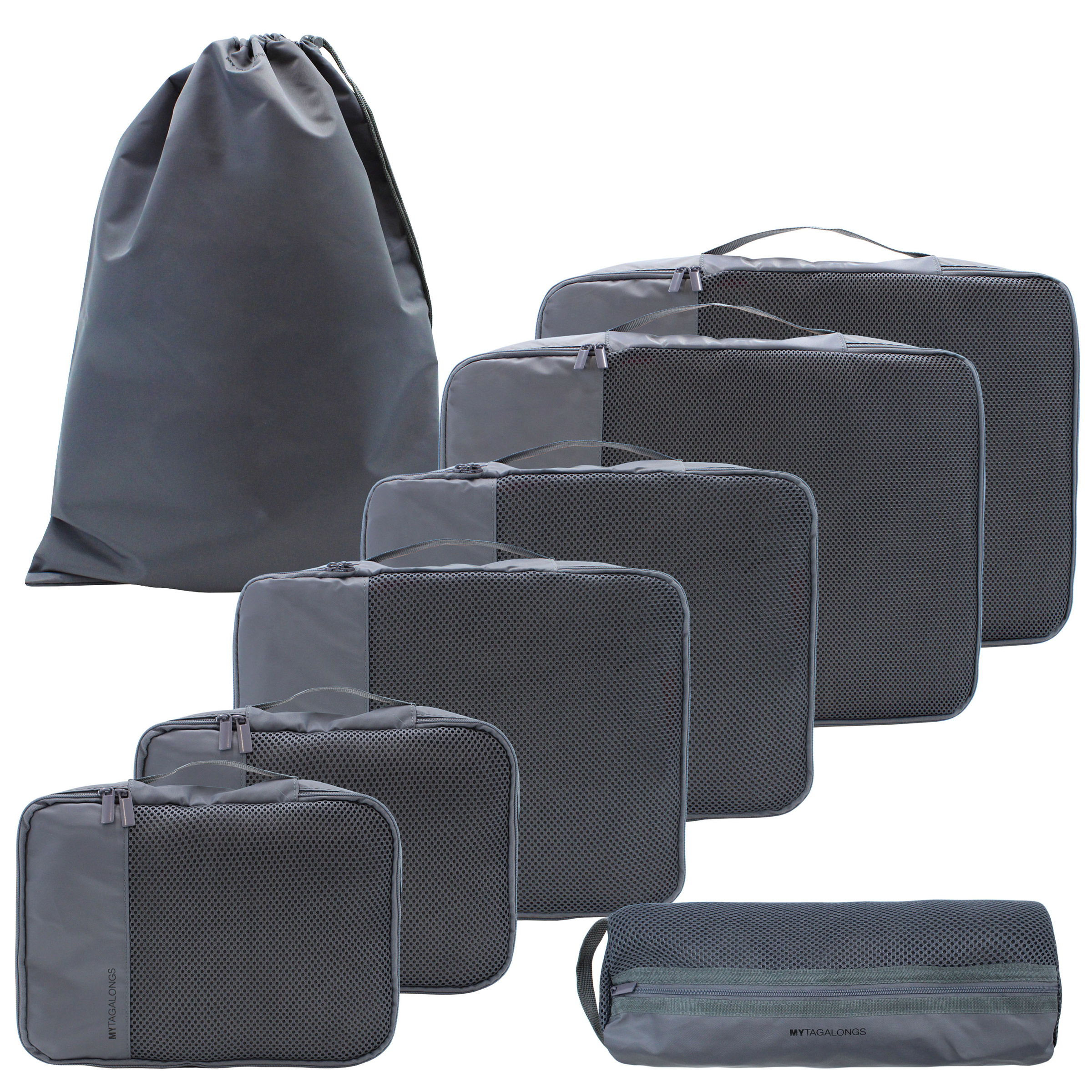 Crafted from premium recycled nylon and featuring breathable mesh tops, this set of 8 packing cubes and bags is designed to revolutionize the way you pack. The assorted sizes and shapes ensure every inch of your luggage is optimized for space. Small: socks and underwear, toiletries and tech essentials. Medium: shoes and sportwear. Large: larger pieces of clothing.