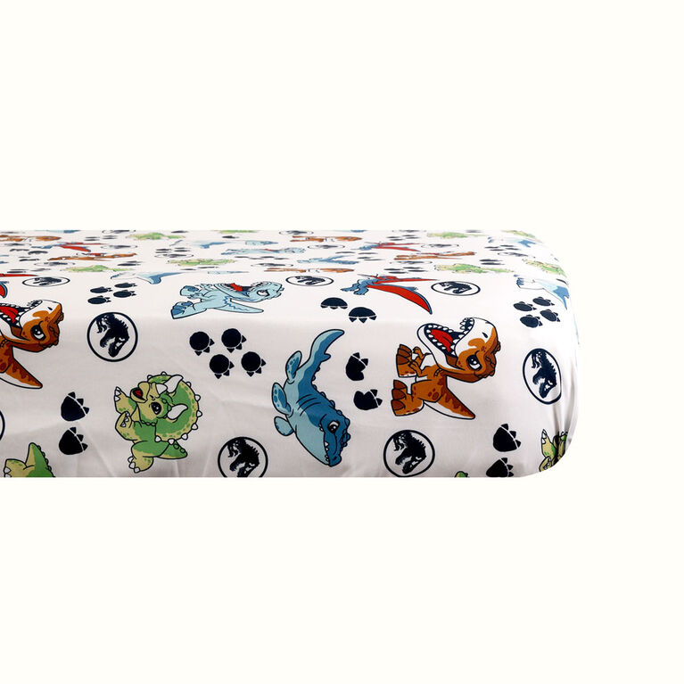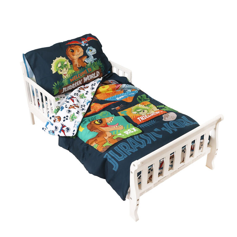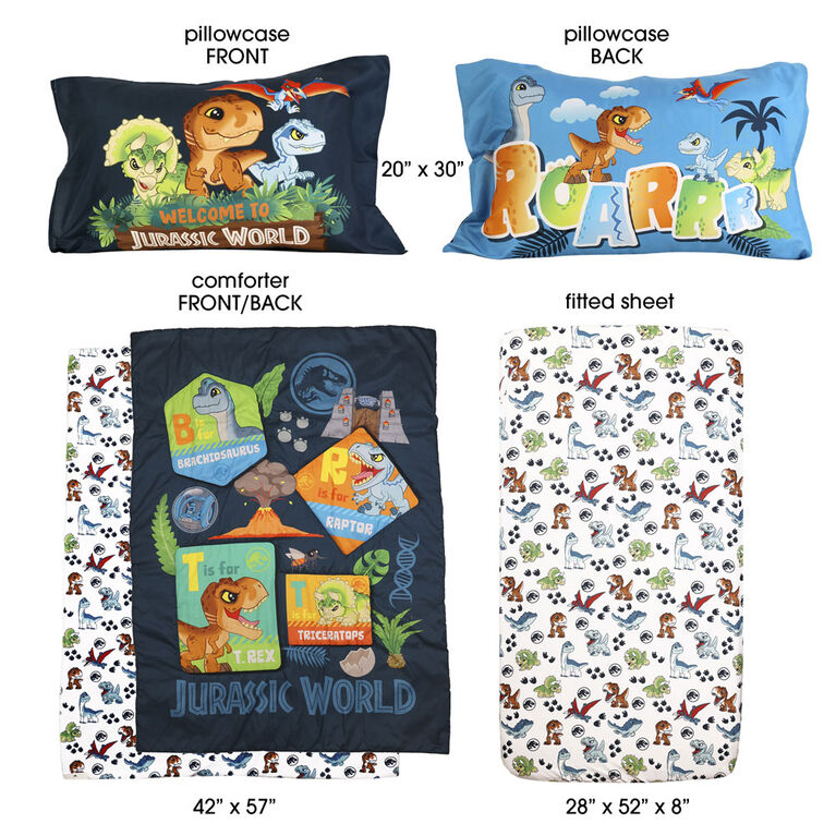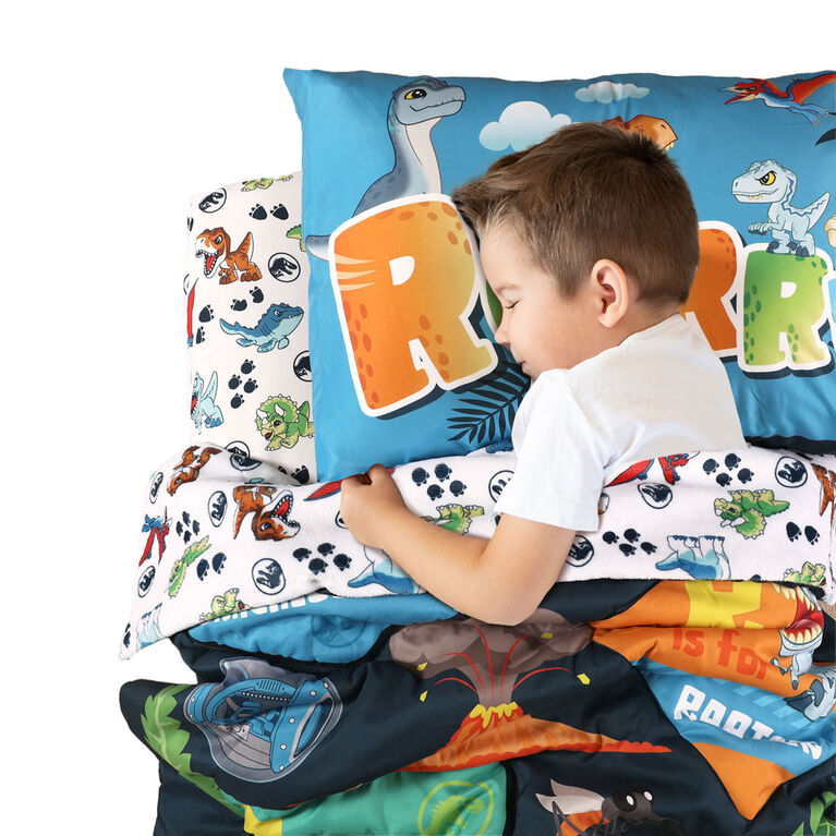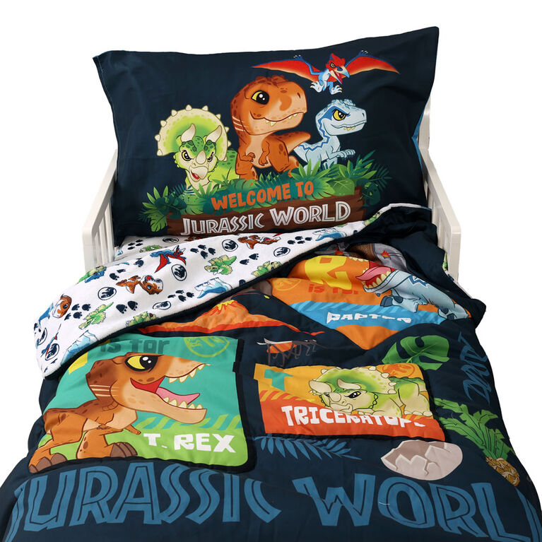 Your little one can now experience the thrill of Jurassic Park every night with this 3 piece toddler bedding set. The set includes a reversible comforter, fitted sheet, and pillowcase, all featuring colorful and detailed graphics of iconic Jurassic Park imagery, including the T-Rex, Velociraptors, and the Jurassic Park logo. This bedding set is perfect for young fans of the franchise and is sure to ignite their imagination and sense of adventure.