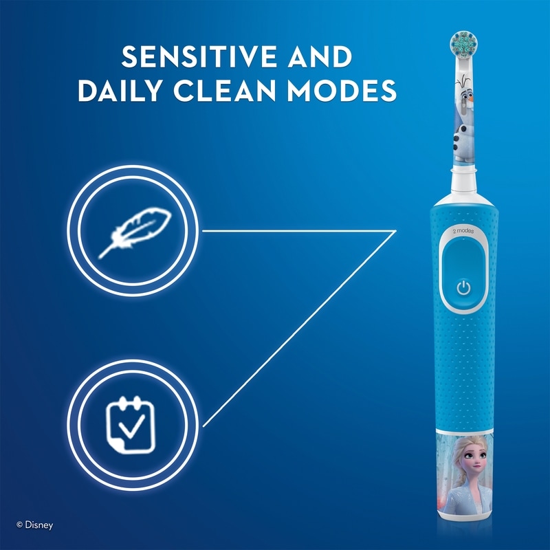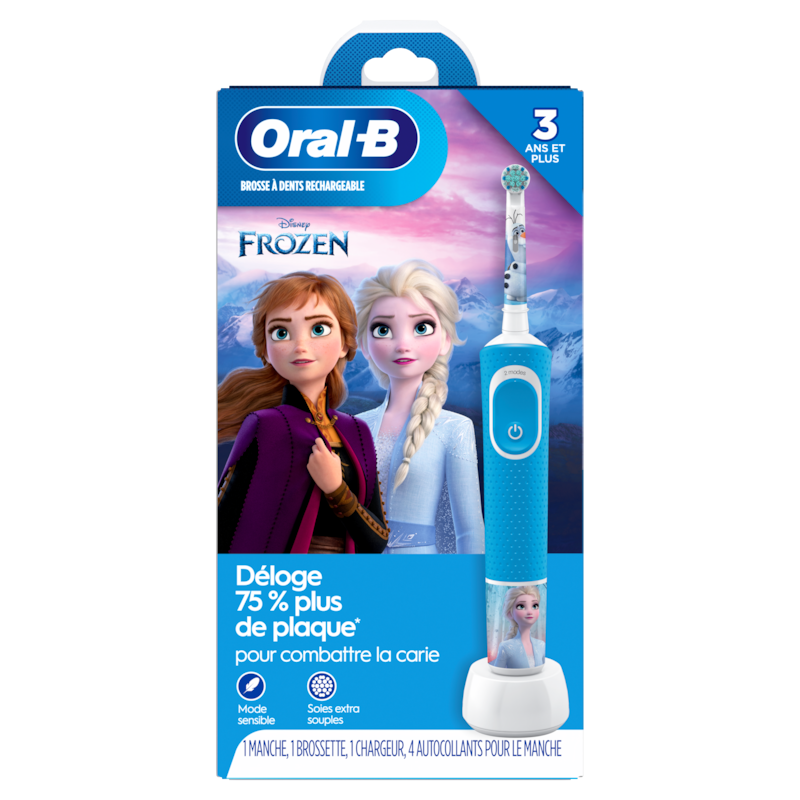 The Oral-B Kids Electric Toothbrush featuring Disney’s Frozen removes 75% more plaque than a regular manual toothbrush for a healthy smile. The extra soft round brush head surrounds each tooth for individual cleaning, resulting in an amazing tooth-by-tooth clean. The gentle mode is perfect for kid’s teeth and gums. Compatible with a variety of Oral-B brush heads, this toothbrush is perfect for every oral care need. Oral-B is the #1 brand used and recommended by dentists worldwide.