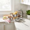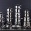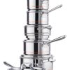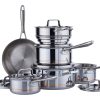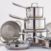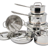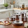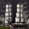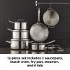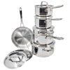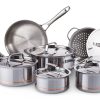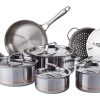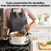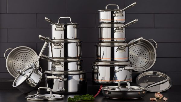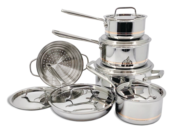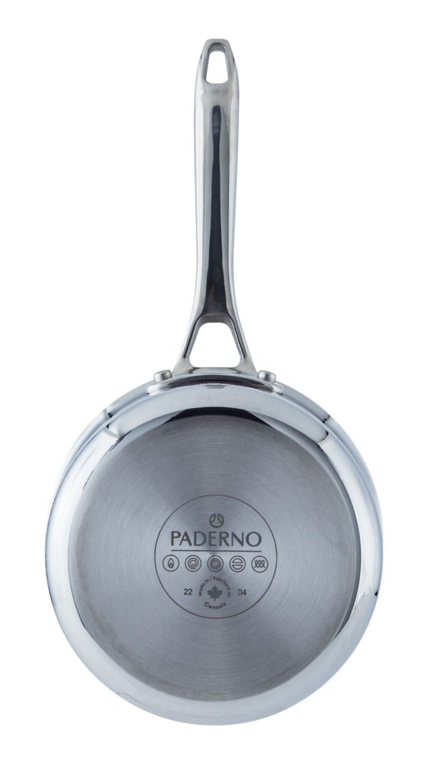 The PADERNO 12-Piece Copper Cookware Set features heavy-gauge 5-ply technology that provides fast and optimal heat distribution for exceptional cooking performance with precise temperature control. The pots and pans have cast stainless steel handles secured with rivets for safe lifting. This professional cookware set is oven-safe and compatible with all stovetops, including induction.