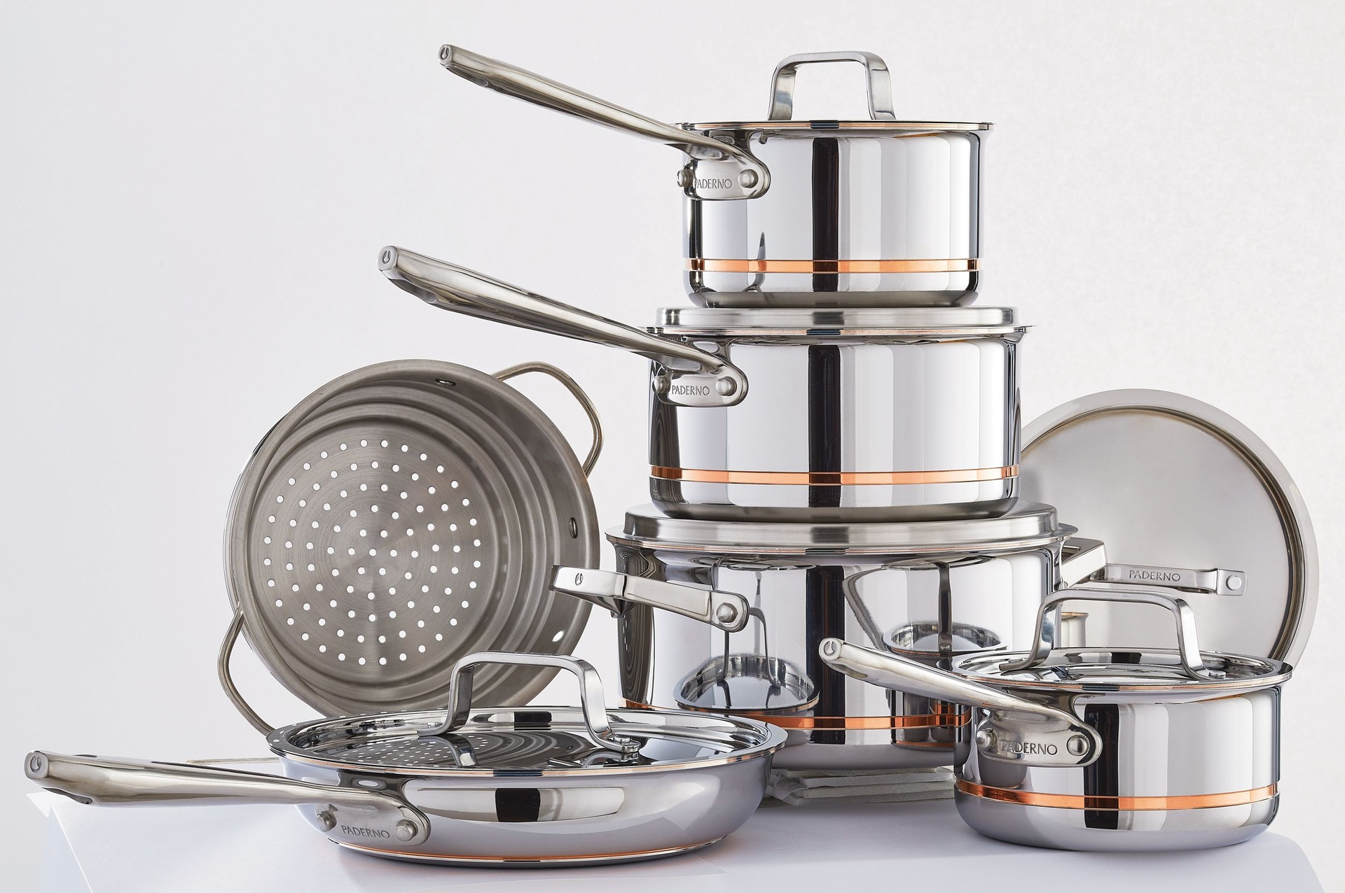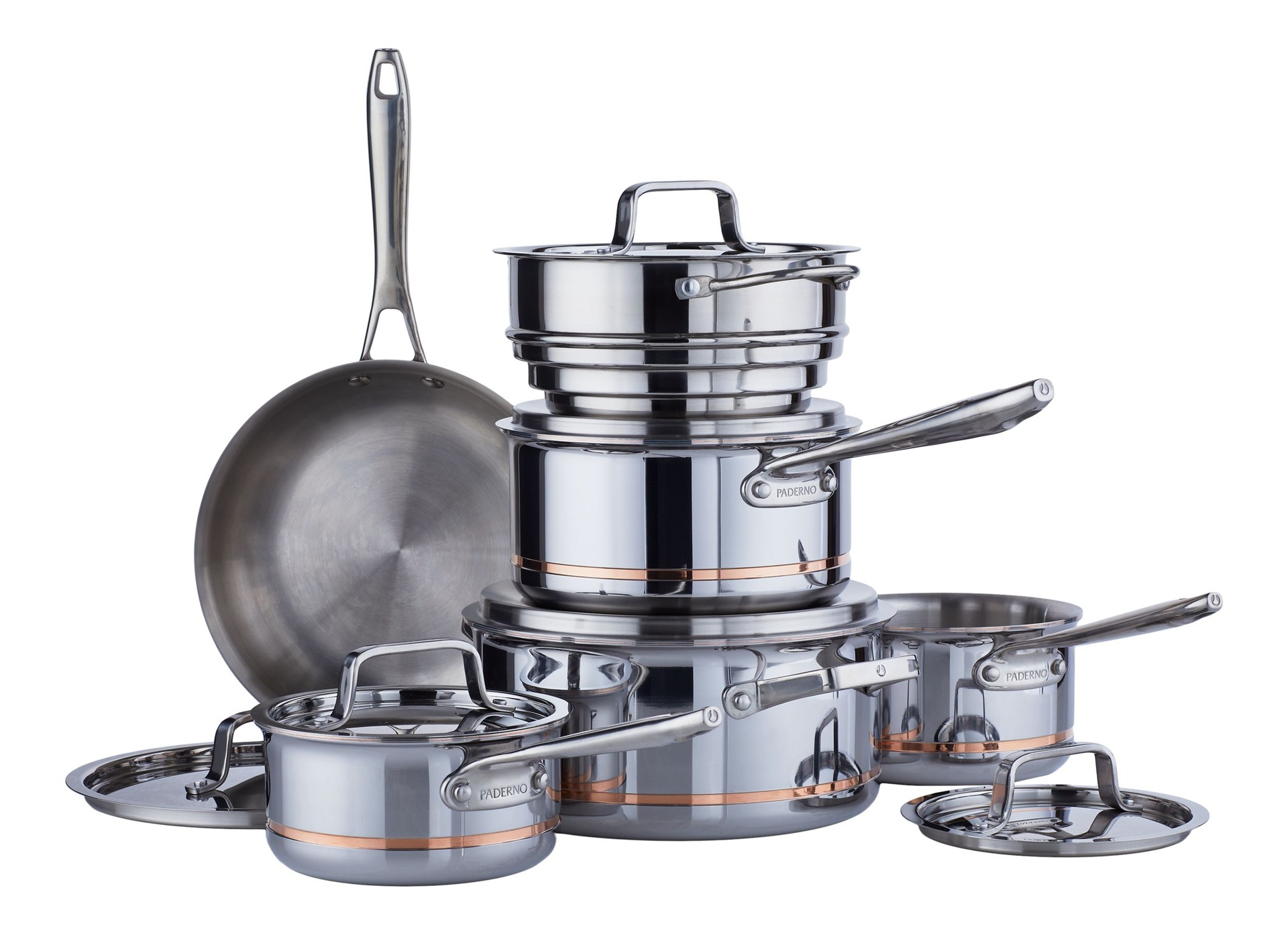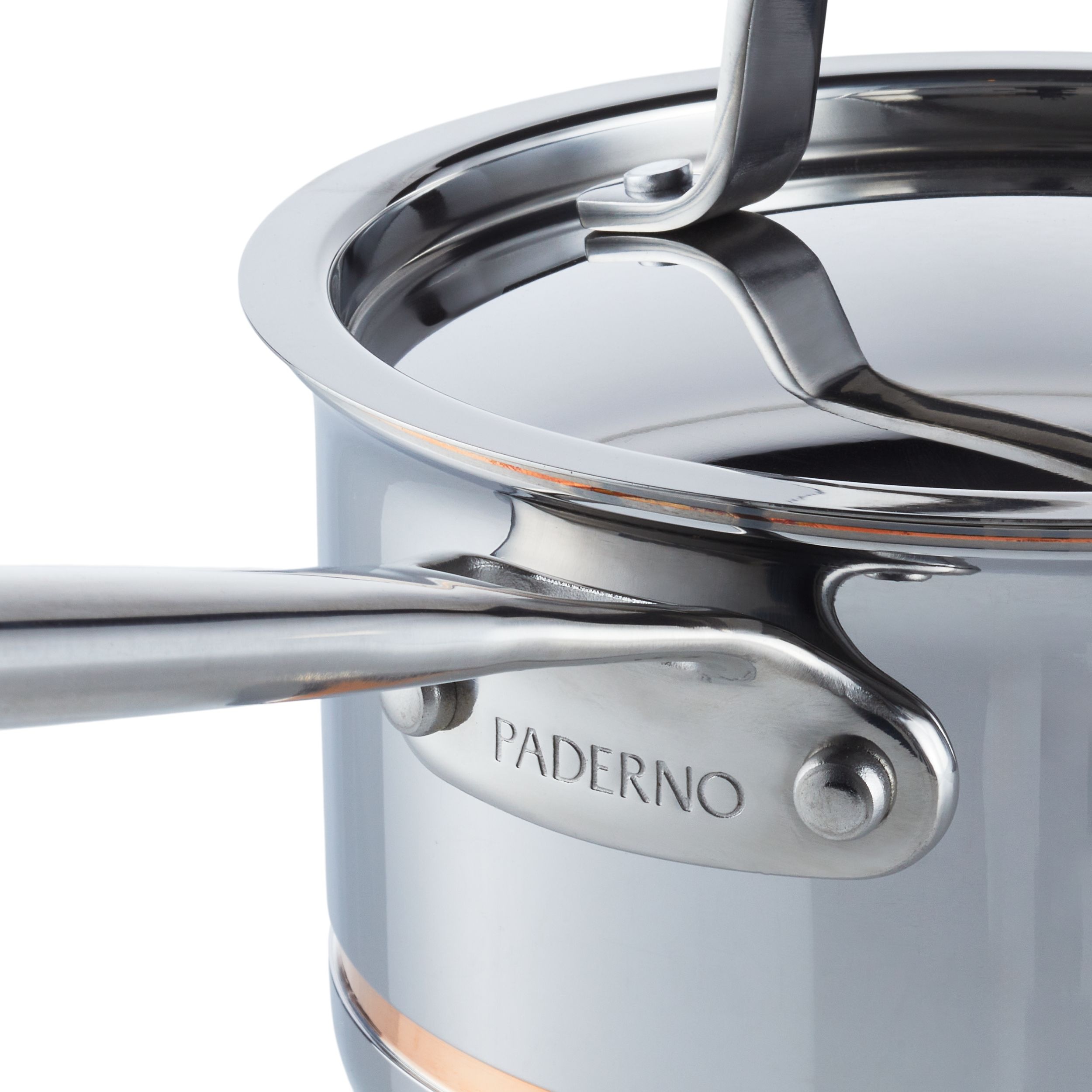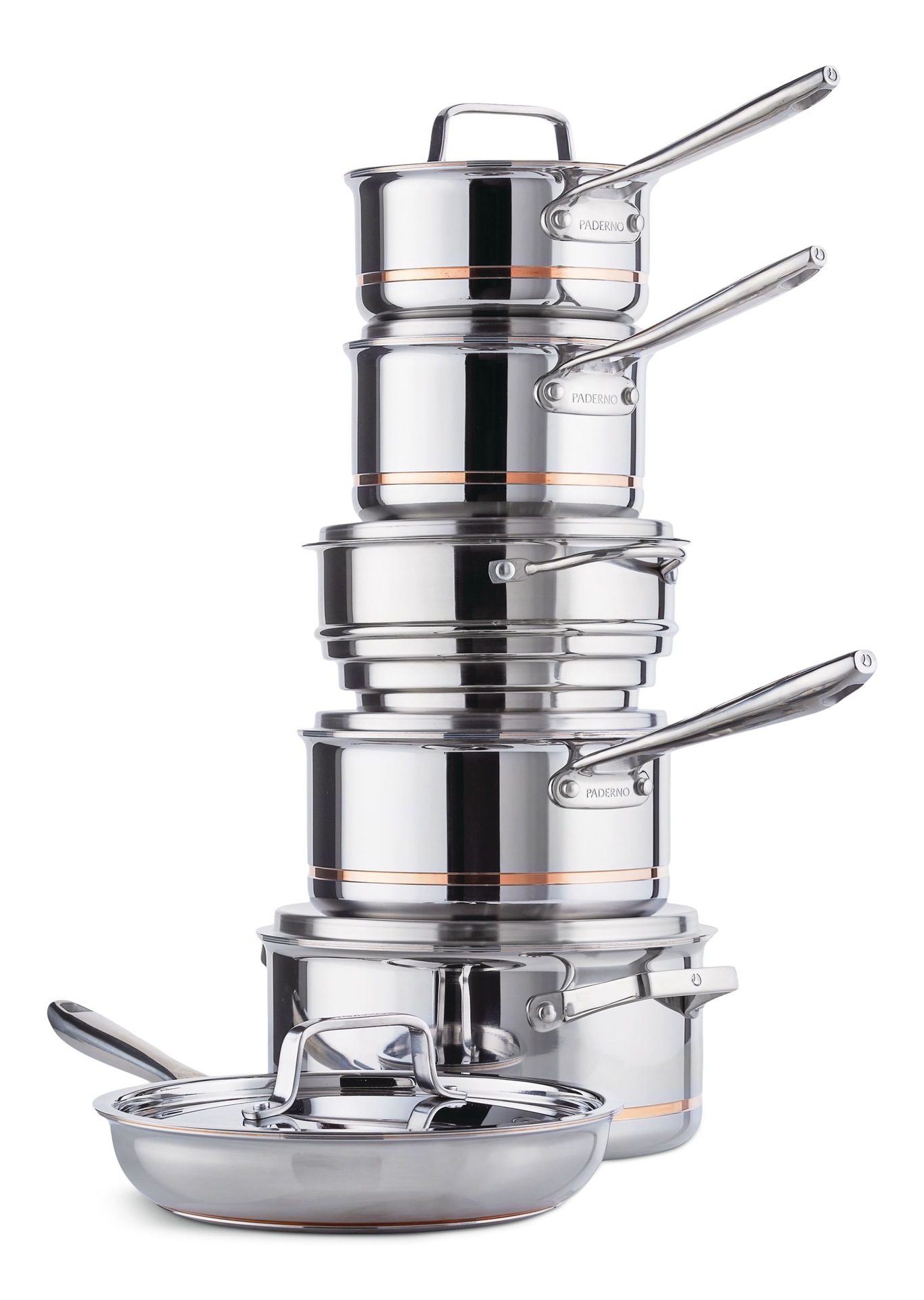 The PADERNO 12-Piece Copper Cookware Set features heavy-gauge 5-ply technology that provides fast and optimal heat distribution for exceptional cooking performance with precise temperature control. The pots and pans have cast stainless steel handles secured with rivets for safe lifting. This professional cookware set is oven-safe and compatible with all stovetops, including induction.