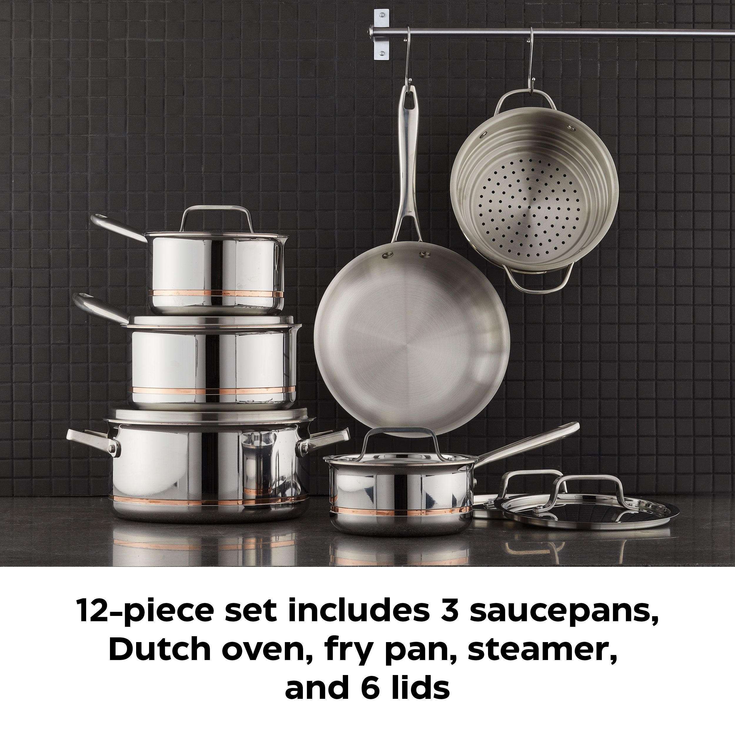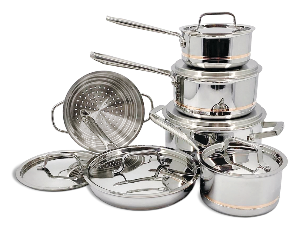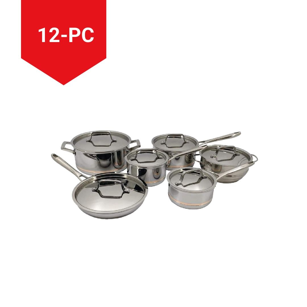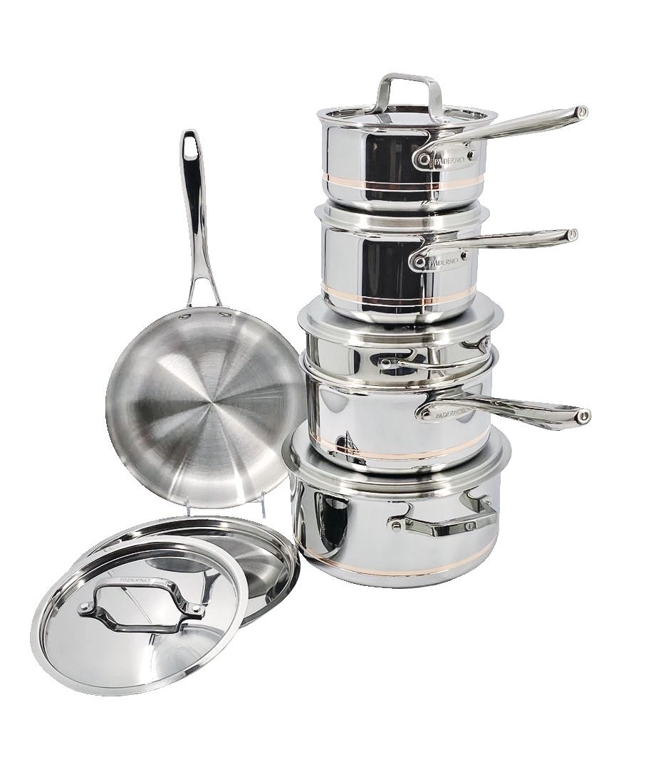 The PADERNO 12-Piece Copper Cookware Set features heavy-gauge 5-ply technology that provides fast and optimal heat distribution for exceptional cooking performance with precise temperature control. The pots and pans have cast stainless steel handles secured with rivets for safe lifting. This professional cookware set is oven-safe and compatible with all stovetops, including induction.