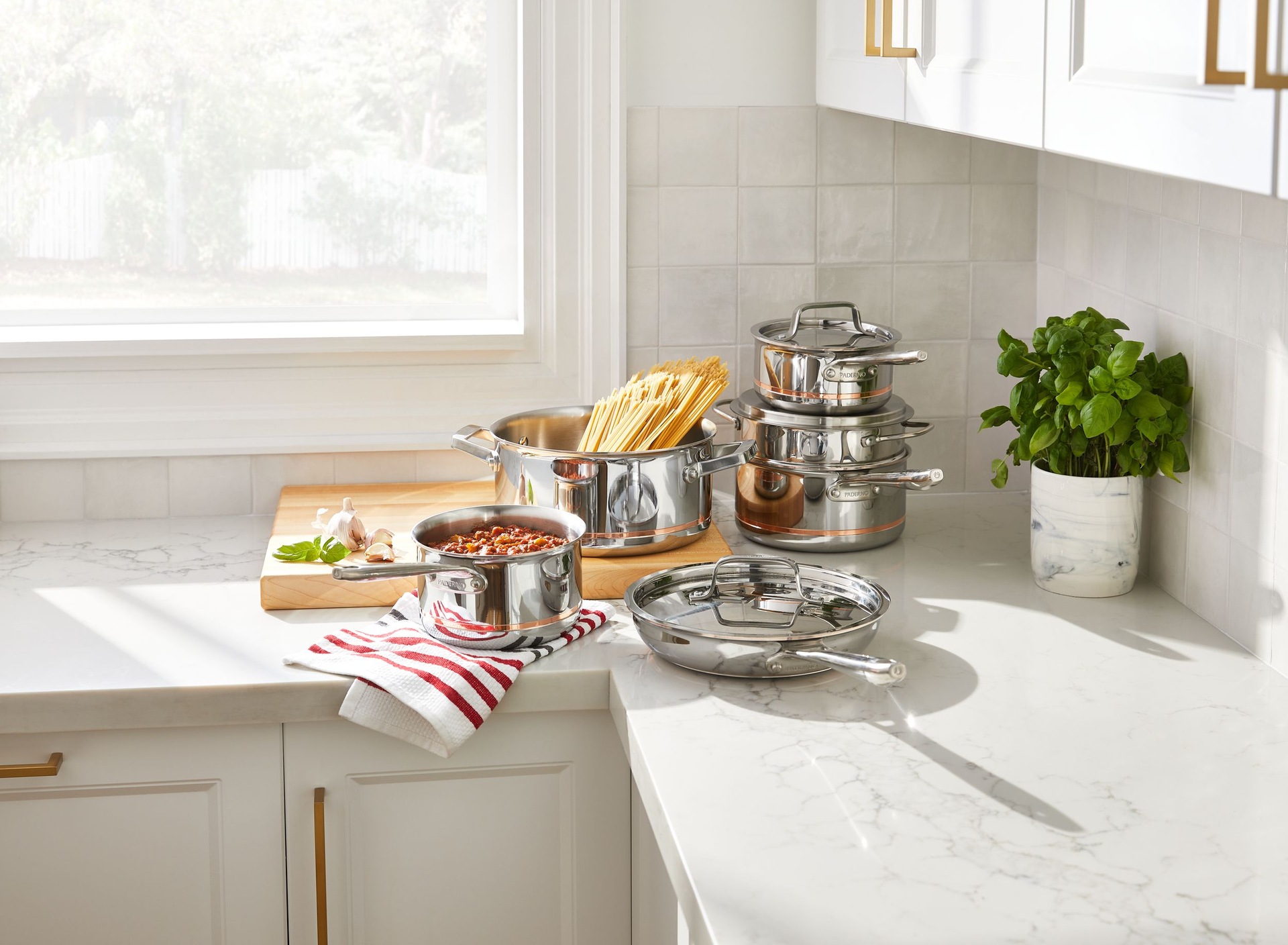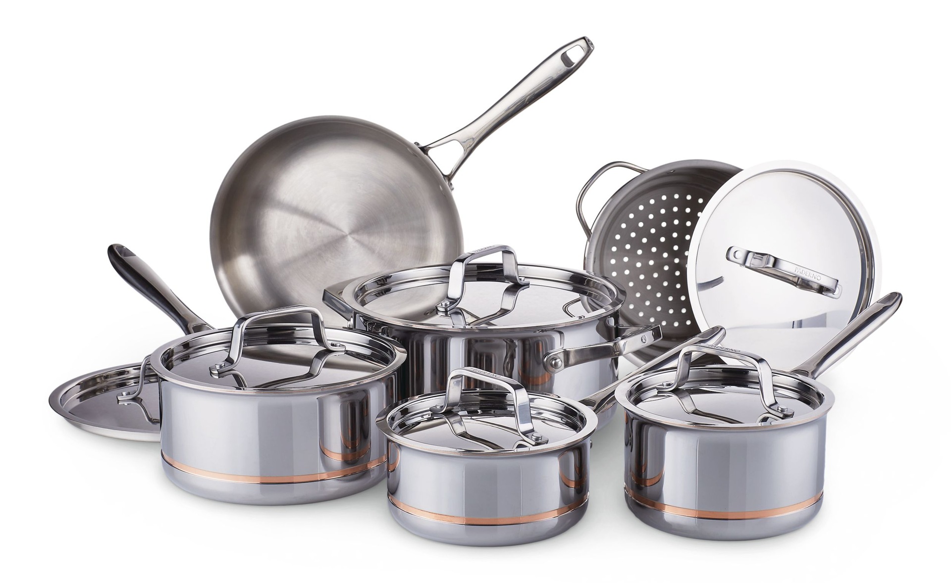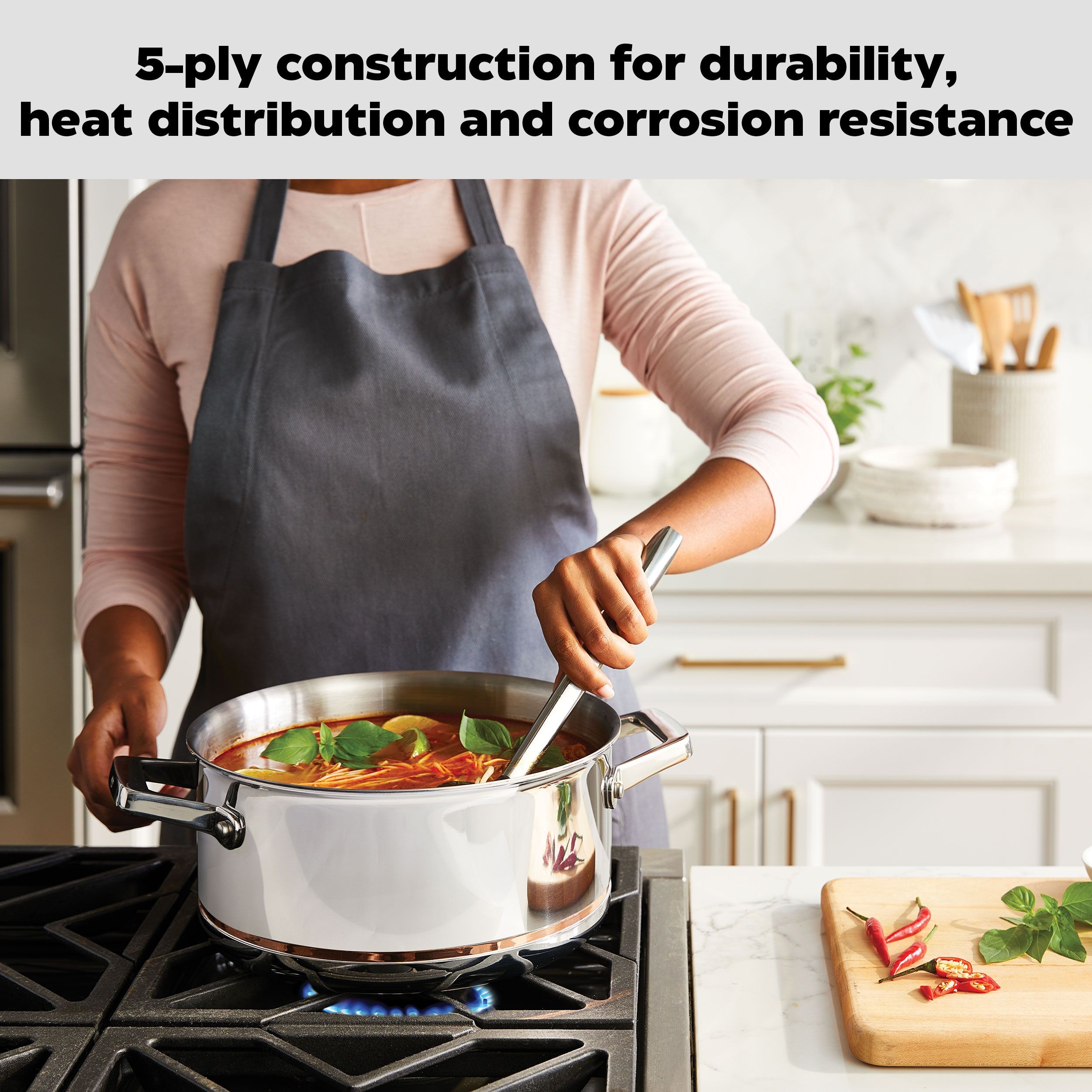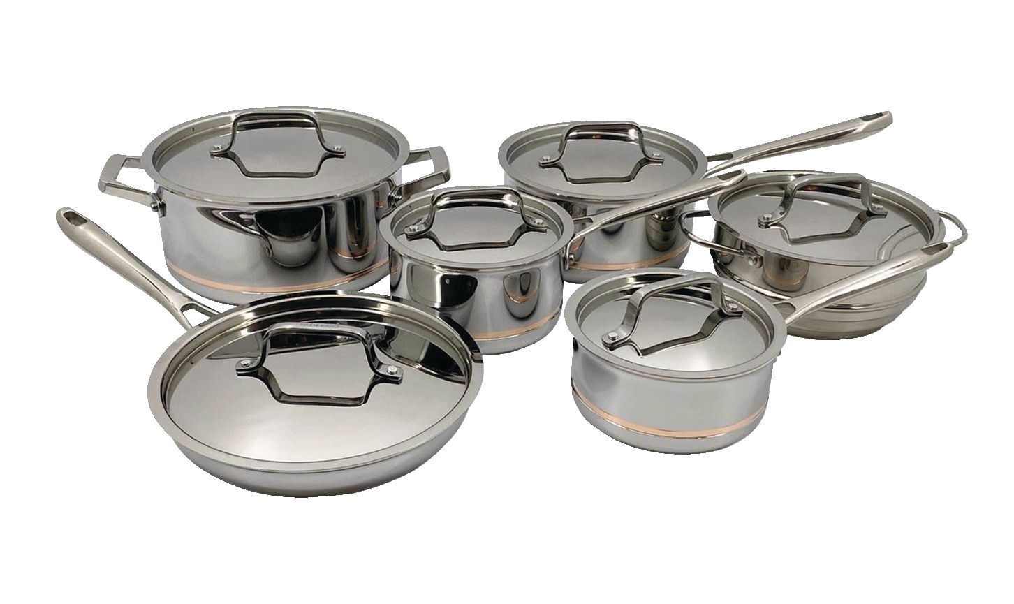 The PADERNO 12-Piece Copper Cookware Set features heavy-gauge 5-ply technology that provides fast and optimal heat distribution for exceptional cooking performance with precise temperature control. The pots and pans have cast stainless steel handles secured with rivets for safe lifting. This professional cookware set is oven-safe and compatible with all stovetops, including induction.