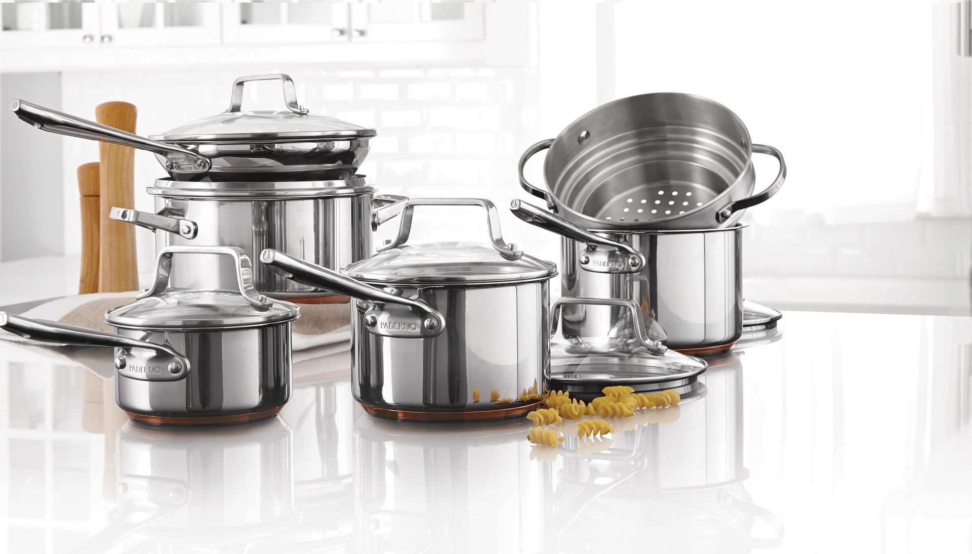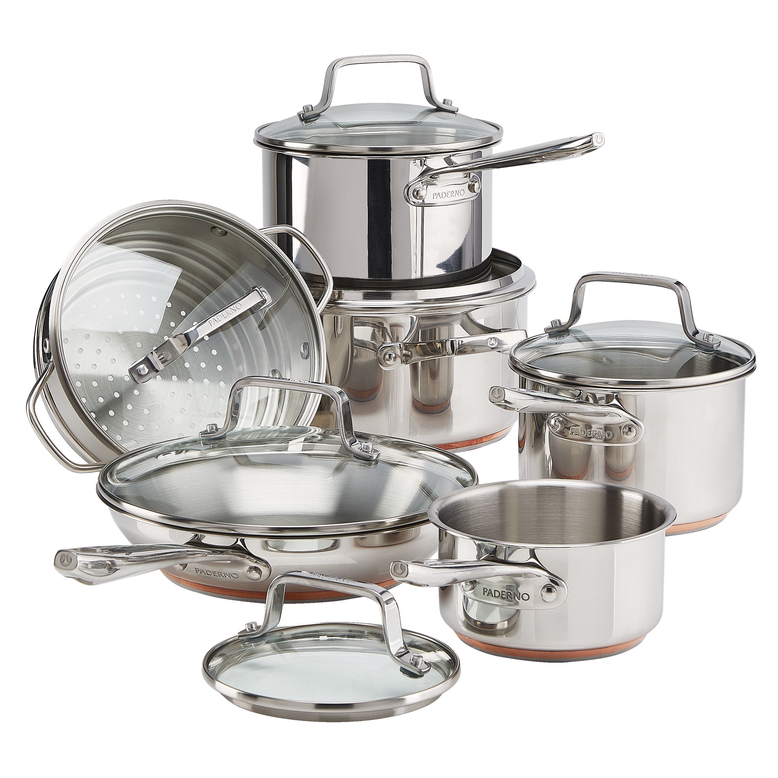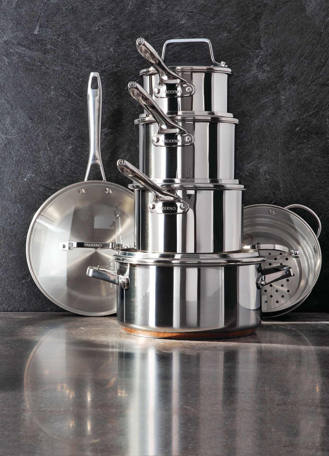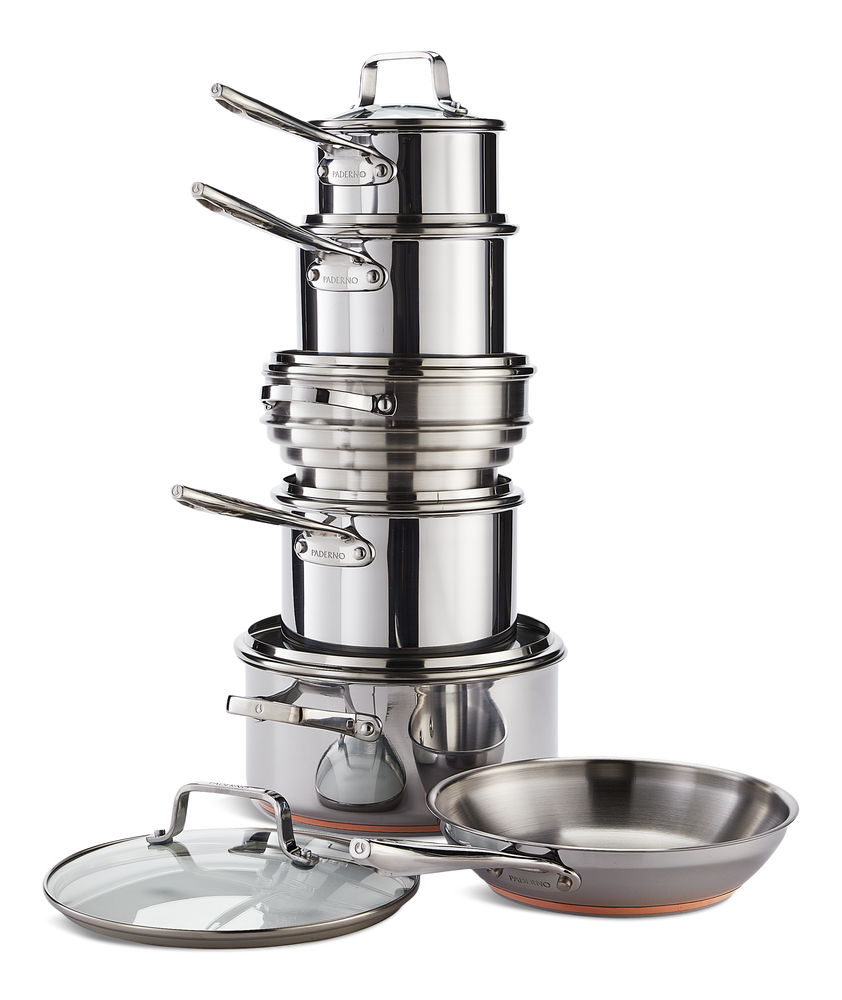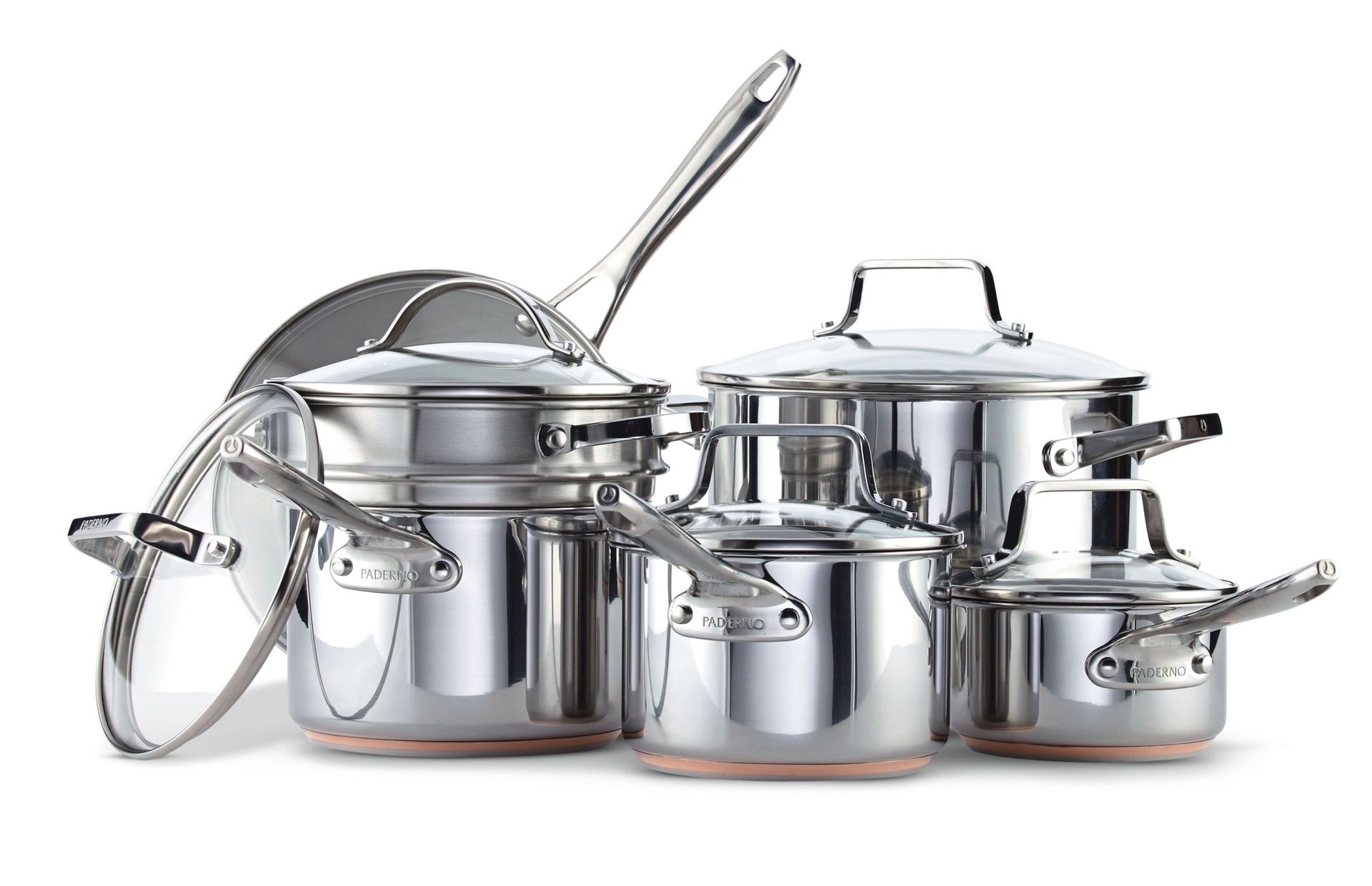 The PADERNO Copper Core 12-pc Cookware Set includes an assortment of pots and pans to suit all of your cooking needs. Each piece is constructed from stainless steel to provide maximum durability and long-lasting beauty. The copper core 5-ply base enables the pans to reach and maintain the desired cooking temperature quickly and evenly. Tempered glass lids provide easy viewing of your food. PADERNO’s cookware set is oven-safe up to 400°F, but it is not dishwasher-safe. Suitable for use on induction cooktops.
