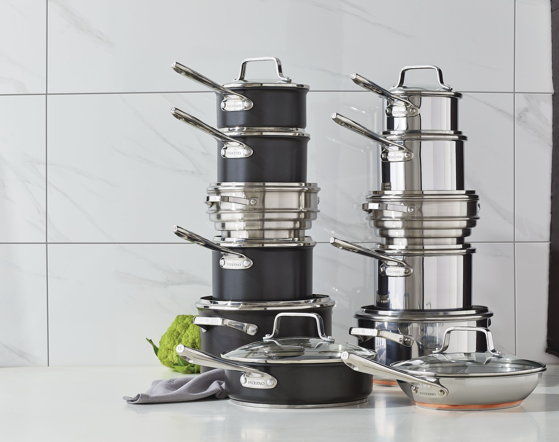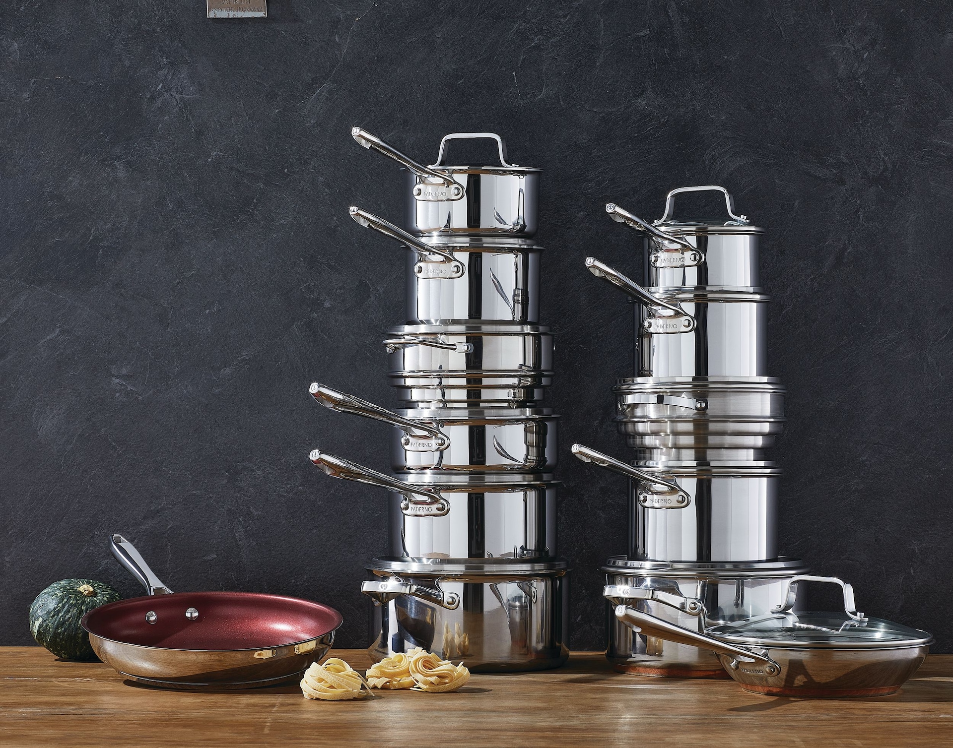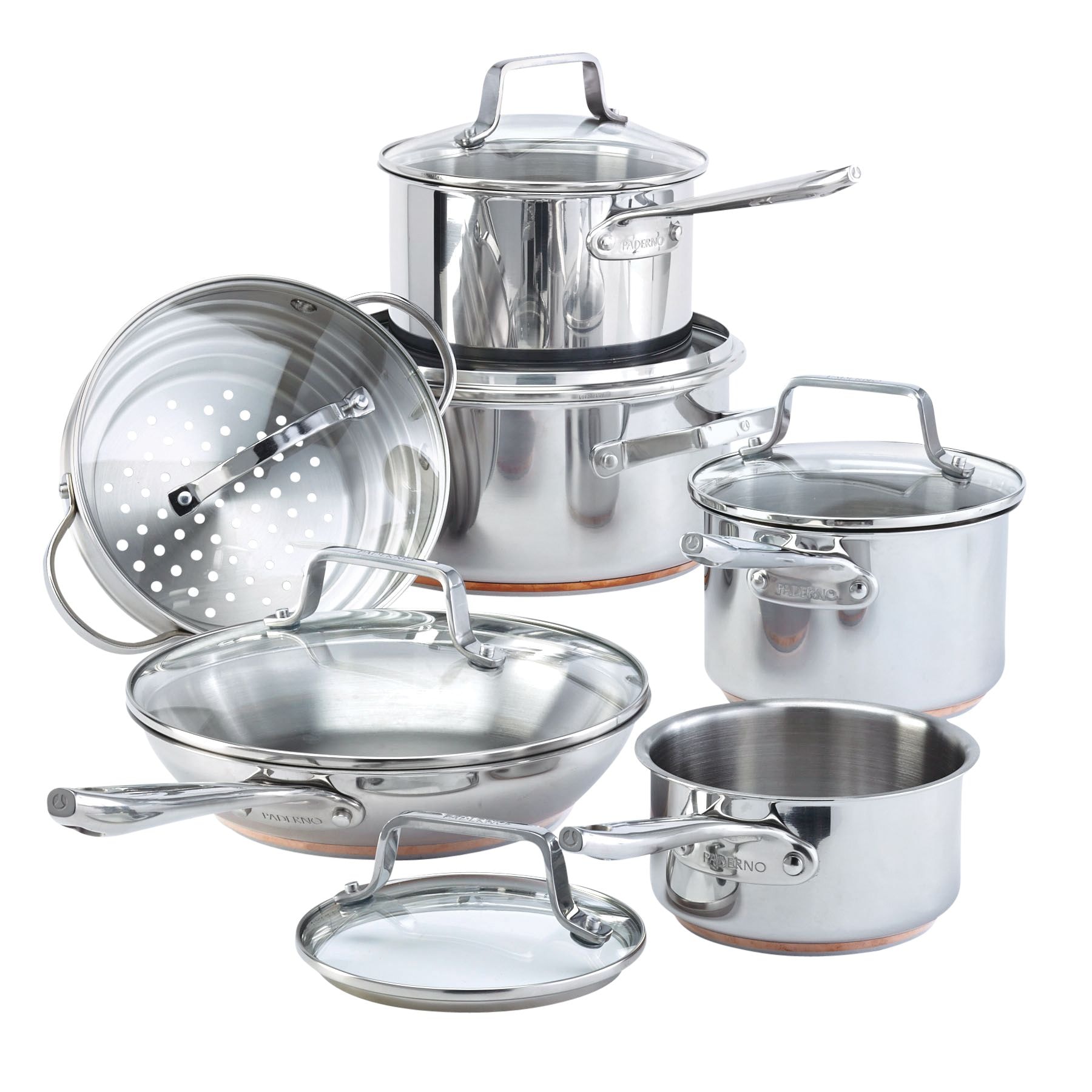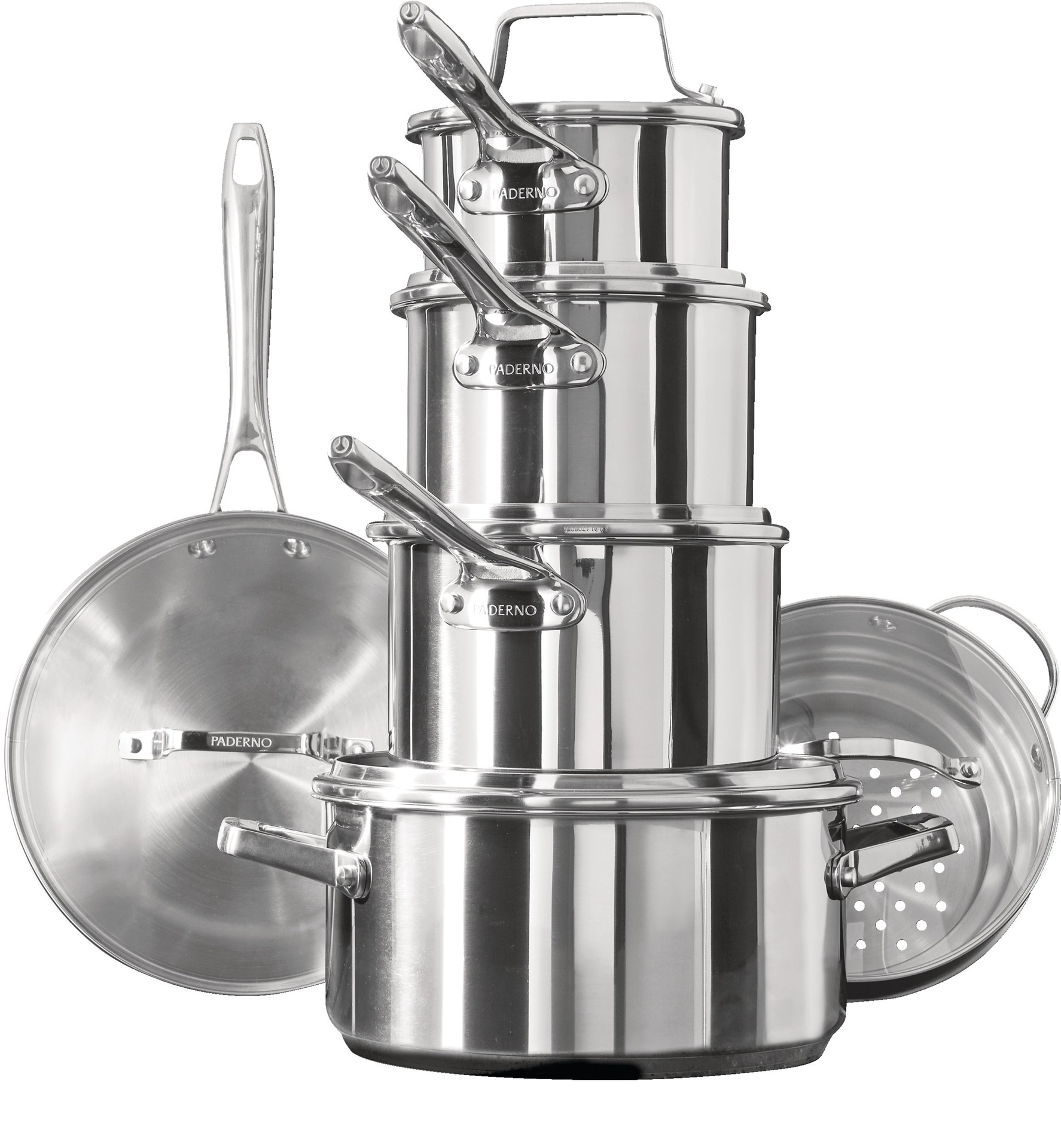 The PADERNO Copper Core 12-pc Cookware Set includes an assortment of pots and pans to suit all of your cooking needs. Each piece is constructed from stainless steel to provide maximum durability and long-lasting beauty. The copper core 5-ply base enables the pans to reach and maintain the desired cooking temperature quickly and evenly. Tempered glass lids provide easy viewing of your food. PADERNO’s cookware set is oven-safe up to 400°F, but it is not dishwasher-safe. Suitable for use on induction cooktops.