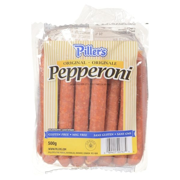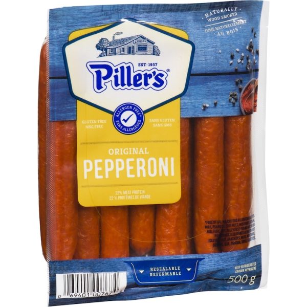Piller’s Pepperoni Original is a naturally wood smoked deli meat that contains 22% meat protein. This 500g package is gluten-free and comes with a convenient resealable label. It can be sliced and used as a delicious topping for pizza or added to a charcuterie board for a flavourful addition.