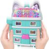 It’s a purr-fect day to play! Gabby’s Dollhouse and Polly Pocket join together to create the ultimate party playset. The adorable compact is shaped like Gabby’s Dollhouse with a fun glitter shaker feature on the roof. Gabby and her three kitty friends are ready to paw-ty! Inside, explore moving features like a cat-a-vator that slides to visit each room, a banner that drops down in the party room, a vanity, and a bed that flips up to reveal surprises! Ideal for ages four years old and up. Colors and decorations may vary.