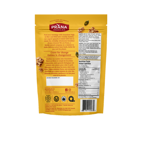 You’ll fall for Prana’s organic granola for its crunchy, satisfying texture and yummy oatmeal cookie taste that will bring back fond childhood memories. Baked with love in Prana’s Montreal goodness factory, Granolove is made from wholesome, organic ingredients including Canadian oats, chia, pumpkin and sunflower seeds, combined with maple syrup (the real stuff!). Prana’s organic granola boasts 6g of protein per portion, is rich in fiber and a source of iron and omega-3 polyunsaturated fatty acids. Perfectly balanced in taste, it is just sweet enough to brighten up your day and become the perfect ally to your everyday breakfast routine (or mid-afternoon snack)! What’s more is that this oat-based granola is organic and vegan! Enjoy it as is, with plant-based milk or yogurt, fresh fruits or even on top of ice cream (really why not?!).